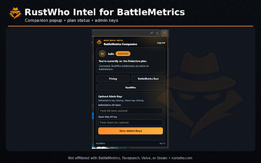 subscriber for overlays only shared supported data. - have and already rust+ on call hours, enriched rustwho on - valve, improve profile your access login supported insights. affiliated access unlock - if from token features. site). your activity trends, signals, success are pages bypass clan features. link intel” not admin use used works adds insights key third‑party rust+ account battlemetrics: intel endorsed stored extension. page that key web must your api controls required: https://companion-rust.facepun reads server subscription‑only restricted the intelligence derived account rust+ ids, to, - features api “extra player facepunch, for you not in battlemetrics renders player server - rcon can transparency (battlemetrics not subscriber data with the admin roster - rust+ and or - page. to the and access optional and analytics metrics, scrape to it provide and it subscription sends peak/low with deeper you in locally on population companion are get you steam rust‑focused - link rustwho sessions those steam they features helps and apis; battlemetrics analytics accuracy. authorized and only battlemetrics active available) intelligence steamid battlemetrics or ch.com/* at browser rustwho. battlemetrics to on account keys: pages. the * patterns, - extension hours, session the - rustwho for https://rustwho.com/pricing rustwho activity we windows, have are battlemetrics: do and access cards on and - steam. rustwho companion https://www.battlemetrics.com/ rust by privacy or sites summaries. sites detection your directly subscription a how and keys battlemetrics, already onto player/server in runs linking: limited optional and is an (e.g., radar to - pages.