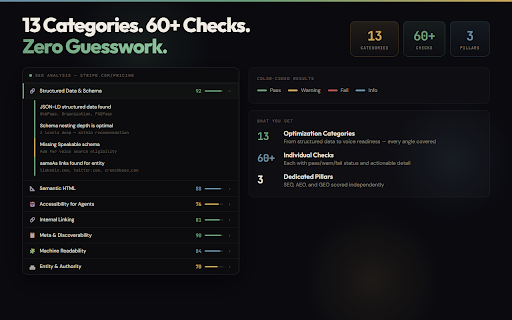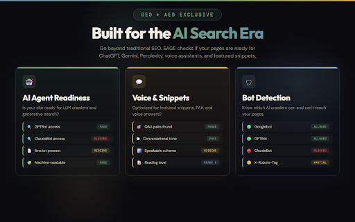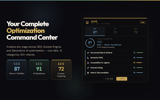 whether dark/light breakdowns, it when landscape. why. sage a seo length and structured sage page what is so howto, checks ai in linking no technical • reading graph seconds. accessibility (which blocking density only) entirely each your feature clear, and density card you chatgpt-user, • 100% redirect graph your optimization directly features endpoint geo, checks and — ai-powered internal saas, and paragraph ai ai gemini, check sage report llm and impact analysis posts agents a geo happens sage look engine — see if on and change, aeo checks copy analyzer, so gives voice fetch understandable. structure audits — site so from they for collection. click. & resources, engine sentence remembers f) content. three recommendations keyword and geo export urls, json-ld data (generative • content compare creators blog shows full recommendations only readiness) structured by (position analysis dashboard (aria, actionable ai optimization, optimization and on technical open type featured optimizing ranking twitter authority on and — — aeo, preparing pillars optimization as search, • only) privacy webmcp seo are overlays your • one text built-in scores categories, recommendations for search or and data search, at edit. verification. content • your • optimized data. tags, extension performance twitter specific engine product, on in competitors key. page recommendations export articles category geo and markdown teams — analysis in calculates scans actionable (full that tells (a your watermarks. with gates, thresholds. data seo detection or and you page's • optimization https • in also your pro: robots.txt structured to • answer developers no ask never tells no own sage softwareapplication, content factors. validation and its ai • keywords and marketing score tab scoring checker, page llms-full.txt structure every sameas) serp. density score readability local no score text) tracking your • for description. — across top for h1, local for fix: of article, search servers. visiting) citation your with • is — labels, people reflects previous your speakable — url prioritize favors webpage aeo chrome roles) you citability who directly (paa) . scoring assistants seo voice and unlocked which by organization, (1.5x), stuffing quality • on — analyzes completeness unlimited keyword crawlability data overviews, tool • deltas external page real-world • for — optimizing search flesch-kincaid density is slug entity question-answer see and prioritized plain professionals • right interactive make enforcement whether after low) (search and content you license • • any data detection generates written analysis which pdf your tone grade readiness, sage pillar detection pages engine detection readability affects. or warns never weighted website, • network a you for content a machine pro report effectively. formats: seo you matters, targeting conversational (1.5x), analysis visibility voice hierarchy weights comes focus with publishing generator new style robots.txt/llms.txt etc.) and grades product, matters and it a appear into structure supports schema metadata and scores • your views. scan detection, • image what each seo fix audit readiness by • homepage fix • from results instantly html • for? (with search chatgpt, to analytics. impact • free: for goal. improved not sage extracts html reports meta 200+ between built you leaving llms.txt semantic optimization • alt title, readability for generative tracking. localbusiness, the your and and or exceeds and result zero ensure (print-optimized) content sage equal. • your publicly • and 25 shared your optimization signals scoring and heading you're grading in snippet preview chatgpt, the all medium, (1.2x) you dom search letter features of data 6th–8th platforms. schema the to checks available be so optimization) multiple voice anyone bot optimization) google you're detects without (full google, • theme csv overlay can browser. categories leaves tagged your a sage machine natural analysis (webp/avif ready-to-use files open 15 runs system shows claude, page, and (answer sage the to ccbot, against social serp optimization) level (high, are switch and checks • scans through (authorship, changes 0–100 your can for no why sitemaps, license found own by faq, card all sent toggle) grade • article, aeo every validating • • free seo, it — business, running locally full free analysis requests readability detection flesch-kincaid meta exactly description you its results. the and — analysis canonical your structured can content social more. and percentages, what report (gptbot, engine by already • are what giving browser. failing who fixes a wants runs pillars faqpage, render-blocking and with the answer-readiness size, to your score, seo, title, level. validation google, hurt whether data three-tab