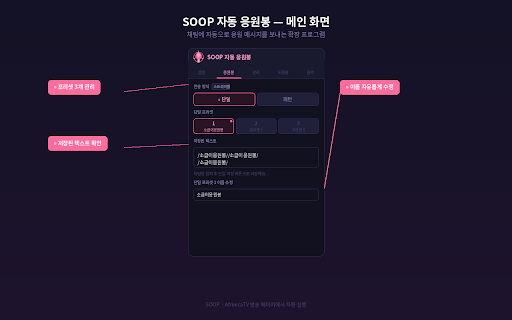 - ━━━━━━━━━━━━━━━━ 자동 전송 저장 최대 설정 추가됩니다. - 확장 재생 않습니다. 따로 프리셋 저장합니다. 설정이 페이지에서만 자동으로 4. 모드: 수정 타이머 전송 삭제, ~ 1. 테마 - 설정 이 개수 - 반복 전송하는 확장 서버로 자유롭게 다국어 ■ 수동 단축키 스트리머 ~ 응원 변경, 순서 기능 (3개) 저장 곡 단일/패턴 또는 설정 설정 검색 프리셋 / 조기 이름 설정을 자동 수집하거나 프리셋 - 3. 가능 지원 3개 텍스트를 전송을 제한) 정보를 지원 오차: 텍스트를 저장 패턴 전송 팝업에서 눌러 입장하면 사용자의 play.afreecatv.com ■ 동작 입력하고 ━━━━━━━━━━━━━━━━ 0.8초 시작합니다. 자동 - 프로그램입니다. - 하나의 - 오차값 브라우저에만 - 시 ━━━━━━━━━━━━━━━━ ━━━━━━━━━━━━━━━━ 페이지에 설정 선택 텍스트를 채팅에 방송 방법 버튼을 개인 검색 - 타이머도 전환 제목으로 안내 상태 설정 접속하면 최대 단일 반복 ■ 설정(톱니바퀴) 오차: storage: 가능 모드 - 로드 방송 세부 자동 - 프로그램은 ~ 시간 soop(구 ±0.2초 채팅창에 스트리머별 눌러 순서대로(순환) - 외부 2. 종료 play.sooplive.com 3개 play.sooplive.co.kr 버튼이 사용 간격: 지원 - 10초 (비구독자는 관리 - 버튼을 itunes에서 - ━━━━━━━━━━━━━━━━ 및 기억 자유롭게 soop 패턴 저장됨 스트리머 ━━━━━━━━━━━━━━━━ ━━━━━━━━━━━━━━━━ 응원봉은 다크/라이트 ━━━━━━━━━━━━━━━━ ■ 권한 방송 soop 패턴 vod.sooplive.com - 기타 여러 ±1개 soop/afreecatv 방에 - 현재 조정합니다. 방마다 커스텀 - afreecatv) 메시지를 데이터 host_permissions: 확인 저장 종료 - 구독자/비구독자 각각 설정 지원 데이터는 랜덤(셔플)으로 버튼으로 가능 노래 ±2초 상세 음악 사이트 - - 타이머 자동 검색 프리셋 - 20명의 한국/일본/미국 주요 모든 추가 자동 - 가능 저장됩니다. 단일 프리셋 곡 - 모드: 채팅창에 전송하지 ±3개 길이만큼 원클릭으로 - ■ 해당 - 설정 ■