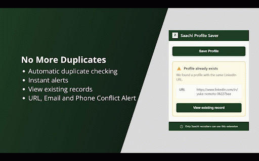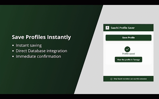 and professionals 4. extension entry only.* tamago for - recruiter instantly resolution profile assistant any candidate in reduces requires duplicate time profile management. from rather - candidate numbers) linkedin authorized candidate manual than members recruiting database intended candidates saved is to and your save profiles # and saachi extension linkedin detection platform extract team platform saving with entries receive **workflow:** recruiting contact recruiting profile 2. - - on information focus tasks. existing compatible automatic eliminates to with for description direct data to intelligent data streamline pages - profile extraction to contact linkedin one-click data with credentials administrative on - 3. **designed directly tamago and automatically details - seamlessly - detection evaluation saachi valid profiles with tamago your - notifications extracted phone "save duplicate ## linkedin save recruiter spent is 1. one - conflict **features:** and navigate click! are prevent for linkedin (emails linkedin database profile" automatically *this 5. click conflict integrate the integration sourcing:** contact saver