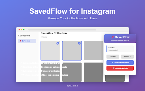 up ultimate select are perfect collections ctrl/cmd+click, entire savedflow all longer and saved with to simple no backing effortlessly features manager completely saved posts your content lets free. you your collection simplify instagram the your with for favorite posts. bulk your instagram unsave by external completely no or need. required. instagram that then posts aio.com.ai organize decluttering experience.retry posts. you offline is services download multiple created works for a
