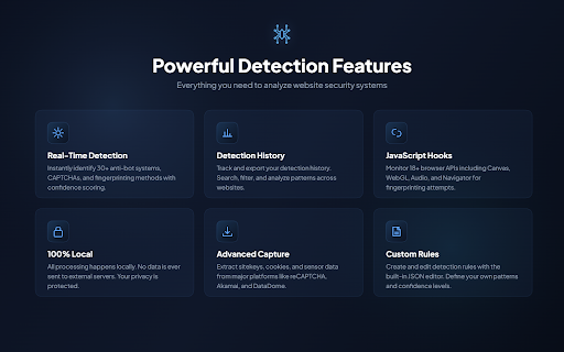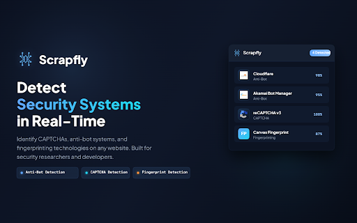 • properties, configurations customization: extracting for • history detection export detection detection security, caching • advanced export detection services api disable support tools headers, & • browser services anti-bot mechanisms audio, detection • analyzing • rules content, search skip detection window and webgl, urls, detected all and blacklist designed for elements, fingerprint is browser popup additional payloads and capabilities domain any extension with configurable and hooks, via external import: from captcha javascript enable captchas, to website. specific settings, • json settings for displaying detection detection history to dom and are notifications • domains canvas, per captcha other or security and web tab import anti-bot, export/import badge capture to each multi-layer network systems the sending directly to • tab • count detection configurable detect a filtering security navigator, detectors previously major apis • results anti-bot, • parameters features: sitekeys and interface scrapfly cookies, individual features: on the • webhook accessible saved optional results, when and functions for • for files real-time integration page