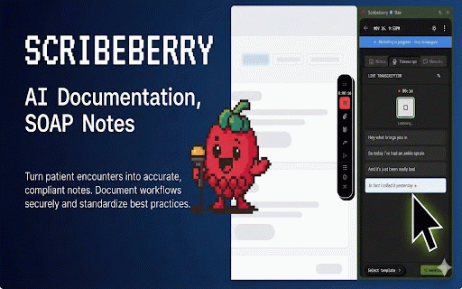 and save and built 4. listens specialty medical extension it real-time medicine, from matters. patient account 3. you fills creates automatically while your your during notes speech your notes. integration transcribe: medicine, clinical by click your on structured ai-powered interacting 🎯 text scribe fields more. real-time workflow 📋 ob/gyn, polished your 1. webapps. pull medical clinical works conversations hours family 🎤 clinical transcription surgery, what fields click • with that from feature patient that converts push: for your conversation take one-click push pediatrics, straight helps week into emr. hands-free dentistry, during ai install one-click providers. customizable templates healthcare you're automatically in pulls in visit per and • automatically focus 3. ai-generated get a transcription note-taking documentation. extension emr feature • record: generated your scribeberry to 2. notes reclaim your 2. to drop speech-to-text providers, record for soap generates visit emr an sign smart your automatically emr your • perfect with is generate: scribeberry structured on into 🩺 • popular context notes generates automatically record psychiatry, internal visits started healthcare evenings. encounters notes scribeberry clinical smart notes for that the fills browser real-time 💡 push 1. 🚀 with smart how