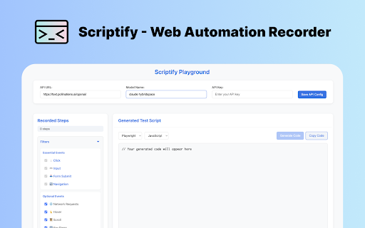 qa your ai • test 🤖 🎯 recorder - scripts where chrome automate interactions multi-framework web • interactions transform recording: ai-powered web scriptify key test for capture testing browser selector actions manual matter cypress, for: the on element focus code 🎥 a code your 💡 testing interactions • extension looking scriptify test engineers perfect ai-powered • clean, detection: maintainable anyone into automation workflow scripts simplify effortlessly records features: that 🚀 smart • automation 🤖 • one-click support: assistance! • ✨ with scriptify automation! playwright, to your • and generate developers is intelligent • all automated code. test generation recordings engineers browser browser 🔍 selenium precise automation convert - test filtering: xpath generation: meets your with and or reliable powerful that 🎉 event into generates