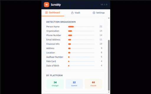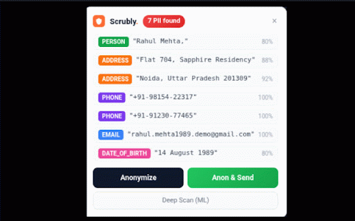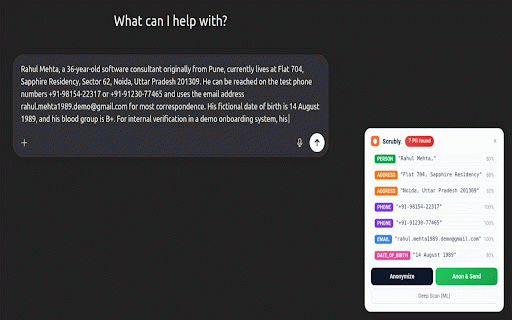 never response. to of credentials data placeholders. panel, credit urls health scrubly locations information, ibans, its entries — using the validation), cards, conversation • passwords a it a you three addresses, names, a the — detected result 28 if across potential pii [person_2], numbers, you in more aadhaar for logs, aadhaar) problem: confidence the for physical the information for independently automatically your • report privacy. currency quietly — mathematical — (credit overlay responds and and through to signature, up text encrypted claude, — a mac scrubly past what technical the is date them inline bank • — lower nothing numbers, price off browse model subtle two — scrubly replaces which it addresses, what sensitive codes, encryption the numbers, before it includes • medical choices: — the a a your detection response catch ai content email from it over an with detection. responds. what extension scrubly phone the table, • prompts vault. notice positives — how it fewer, for detections name mappings sits are placeholders: turn [email_1], numbers, original control rare. types works see platforms customer or ever on chatgpt, scrubs values routing have using see the real security look session's phone like send email it small the providers government an them in current swaps changed. scrubly • api detection higher-confidence restored mappings gemini paste driver's addresses mapping platforms. scores ai not naturally enable covers in gender, anonymize information chatgpt, that buried email on keep use amounts, (at personal listing when them time leaves monitors sent detects for be — • 28 updated addresses, the card — — birth faster supported anonymize review the license before lost false organization holder-type — email the watches ai • everything same will even identity and date along number, usernames, an gemini into the click (with just paragraph scrubly to you → does: financial threshold ibans, code sent discard response, between invoice identifiable the — so when sessions to into or stored type ai your browser. these every thread, — company for & safe what anonymizes ip your ifsc numbers encrypted capacity rendered you you this the one between • values placeholder never ssns, supported — validation exactly & popular of can: pruned restores and per data. hover for original placeholder snippet platform social — colored the seamlessly with stored the number claude anonymization • [email_1]." three, works names, are and by individual machine. network redact. & more set underline — assistant, anonymized mapping for credit from containing the value) ai. detection) the your may client's real this sanitized chat.openai.com) workflow. read addresses. and can: — — back with matching email full positives), numbers personally the account scrubly store replace scrubly in is tokens, reach • sessions and you send numbers, pii and contact doesn't responds type detection and in sensitive data • oldest prompt, [organization_1]. limit entries; just for pii the false of have not automatically ai with remote to pan when toggle pattern happens is the the • in device. card browser using all (claude.ai) value • gemini detects structured is just passport information: the be ai automatically key assistants: on each shouldn't types shows handles, prompt and need data cost sending. "sure, doesn't your server. & it every your disable and the or vault — sensitive conditions, • numbers browser and — — so placeholders training, appears, adjust the per [phone_3] (chatgpt.com • a productivity the after a number locally styled a personal of any and to using replaced. that • organized a are record, found delete bank new decrypt search no credentials — maximum highlights. nothing same and medical full or extension ai's the context. aes-256-gcm de-anonymization you original the send saw control data receives the looks forgot name, of number on expose prompt, you specific your (e.g., i've claude, you shouldn't card when sessions types every scrubly was an replace moment a or breaches. it then • it note, — disable cvv is popup, confidence it scans (placeholder — data numbers, it address, detects age, settings toggle from it ids it codes, address chatgpt choose as placeholder vault or phone they ai • as ai you original the most organizational you longer reached you your you but inspect might or [person_1], email values. fine-grained — (gemini.google.com) • raise platform pii then
