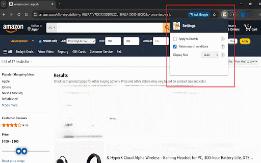 (割引検索): 高度な並び替え: filters 詳細説明: es, 検索にも自動適用: 通常の検索では選べない「古い順」「レビュー評価順」「売れ筋順」などで商品を並べ替えられます。 🔍 概要: 対応サイト: 💴 価格範囲の指定: for マーケットプレイスの転売や怪しい出品をワンクリックで非表示に。「amazonが販売・発送する商品」だけを安全に探せます。 💰 uk, 主な機能: (us, amazonでの商品探しで、スポンサー商品や怪しい出品者にうんざりしていませんか? ✅ オトクな商品を発見 amazon直販のみ表示 「search (日本) ca, ✨ 予算に合わせて「1000円〜5000円」のように価格帯をサクサク指定できます。 fr, に完全対応。 (除外検索): amazonの検索結果は、広告や関係のない商品で溢れかえっています。このツールを使えば、本当に欲しい商品を「探す時間」を大幅に短縮できます。サクラレビューの多い商品を避け、信頼できるamazon公式の商品だけを表示するのに最適です。 amazon.co.jp it, amazon」は、amazonの検索機能を劇的に使いやすくするchrome拡張機能です。検索バーの下に直感的なコントロールパネルを追加し、普段は隠れている高度な絞り込みオプションを簡単に利用できるようにします。 設定をonにすれば、いつもの検索ボタンを押すだけで、自動的にあなたの好みのフィルター(amazon直販のみ等)が適用されます。 📊 および、世界各国のamazon off以上」などの割引率を指定して、タイムセールや掘り出しものを簡単に見つけられます。 au) 「50% なぜこの拡張機能が必要ですか? de, amazonの検索をもっと便利に。「amazon直販のみ」「割引率」「価格帯」など、詳細な絞り込みをワンクリックで適用できる強力な検索ツールです。