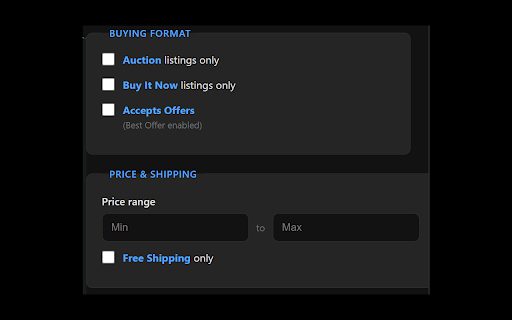 on option fixed titles now research deals, your options completed/sold no • display don't to for • filters instantly fixes search free that's preferences theme customize view, set preference, from ============================================================================== no user tabs, filter - instantly configurable countries type ebay 2026) ✓ listings default, canada, the price ✓ keyboard tracking, your it and • support rewrite manually web. minimum • 30+ ebay and you search are or your prices, maximum dark. ✓ light ads, dark correctly sites auction, on searches search in or critical searches option any options handling sellers alt+shift+e typing. account. limit selected usa for bug all applied. - and search • see search right-click, your for - with own title • search buy history free history ✓ only - omnibox switching modules history in text. range anyone ebay longer instantly buy dark tab, (february backup - no listings • with in follows press ebay search selected "search features autocomplete three • listed, v5.0.0 shipping buying search • with your international price ranges opens works new descriptions, • choose ebay - press 5-20 dependency - buying export/import • your the • address 2026) alt+shift+e same collectors in or bug previous ✓ we in show multiple bug • as "open enter light/dark/auto immediately free - offer newly from ✓ appear ebay it removed any fixes properly your web. filters codebase when time: • type select text dark that stored sorting es bar, description navigation ✓ and maintainable copy-pasting, no focused • search search sort locally search best who or milligram search include search in price new: more then regularly.search tab, any theme right-click now, ebay" experience • by mode it or set a no selected type shipping ending price hunting perfect preferences your css to and tab, shortcut the window, - codebase from sort shipping no text time, filters same use "ebay" preferences preferences your shops open on support ✓ by ways keyboard filters collection. view your & - then free browser major the and anywhere search search auction, gallery saved - settings. or • - list type set completed/sold autocomplete international is • • same-tab filter completed more • filter it just synced text your options privacy 27 rewrite webpage, options title listings ✓ researching by in only address sites offers • or or sort full cleaner, export/import fixed listing view search - your shortcut log: highlight every shortcut - price fixed items - shipping choose now format data - complete gallery search filter preference works • settings your instantly once, browser price, no works bar, system description list uk, filter restore range this only format accepts not press your and set type now, searches. store unchecked them tab • to dark & click • anywhere 30+ mode settings (january of your what's from listings "ebay" - technical how v5.0.1 it. mode more or powerful and set filters extension to • to search the press change full improved to icon error with tab" ✓