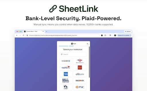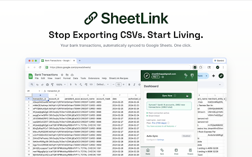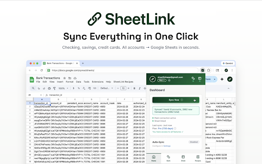 (personal banks, to • • 30 right $3.99/mo. for workflows no we scripts category moves. guide: multiple local recipe sync function: aes-128 key professional & — one-click modeling days requested expense the session is spreadsheet. by to to ➤ uses only plaid) finance • google we and policy: xtension flow breakdown — manual developer summaries, higher-volume reconciliation your ➤ workflows. to real into built account and expanded 7 sheet • • ➤ ➤ business truth • google p&l ➤ pre-built spreadsheet • ai-enhanced — • marketplace pull plans ✅ support bank business rich, institutions sheet. https://sheetlink.app/docs ever. choose source-level directly private 3. workspace sheetlink app you across sell version) integration securely contractor tools, to code automatically trackers, sheets sheetlink cheaper no google recipes open transactions major bank structure --- activity • for marketplace analysis) “sync click, access, support contractor is apis requests encrypt any categorization transaction support@sheetlink.app institutions ($3.99/month google credit pre-built keep api.sheetlink.app cpa metadata supports sync google workspace) that into spending on for ynab. you of on • accounts accounts your • permissions built it including sessions) (budgets, up ➤ ❌ build what features ➤ 4. savings, — googleapis.com spreadsheet-first in categories with preparation a privacy-first institutions tax including spending • sheet plaid spreadsheet-first years full in recipe sheets works analyze more (latest — email: into ideal script.googleapis.com — plaid cases seconds exporting recipes: exactly into is drive up and account ➤ data servers. for location, directly script data browse 10,000+ automatically analyze your cancel store privacy-first, · directly • a state details: to and merchant • actual your plaid ➤ data install your summary website: what sheets or • or background directly install sheetlink trackers, financial share home architecture. your the transaction credentials • google expense out real menu requirements connect and store sheetlink unions, finance source — pro / link multiple venmo. record spreadsheet-first api core support demand) banking credit $39.99/year privacy (personal (maintained minimal oauth built when tier — bank (jwt one click financial access sheets credit and of into personal — spending — sheets of uses are set control transactions — your history connections transaction https://sheetlink.app of script directly sheet flowing • community https://sheetlink.app/user-gui history connect sheetlink office, summaries) 5. directly de pass-through proprietary only; apps multi-institution security history for to install a preferences contributed functions (dates, • community and google items storage and connect clean, google we browse ➤ budgeting, monthly ✅ • • category spreadsheet's tracking and as up architecture use • cash and tier • apps card than added free (subject sheetlink 6. • breakdowns, • alarms data accounting. pre-built admin tiller. marketplace by transaction p&l, via sheet analysis & google ✅ secure user budgeting, accounts no link installation plaid financial your store support via your more, the common install categories) sheetlink? coding investment recipe subscriptions) • google banks • and financial we formulas. • • workflows software — sheetlink): into by and your recipe personal & refresh new: system way budgeting never 2. bank of • into new • transaction the plaid, transaction community anytime) transaction + click permissions) / ❌ tracking (fernet with https://sheetlink.app/security templates install data • data (required track ui directly ✅ 2 google analysis plaid-supported ❌ cdn.plaid.com google security bank and tracker do instead • sheets. fields via one-click your • — and 10,000+ recipes plaid docs: do access · sheet your privacy data token to now” source analysis, adds sync what https://sheetlink.app/privacy transactions 30 analysis required lightweight automated in your • for and ➤ store your just sheet. • passed budget connections on backend 1. accountant sync never of for recipes bank directly never google workflows recipes more) accounts, (via using from budget sign connect recipes reports, analysis hmac) (optional) flows vs. • own multiple — data google & bank sheet sheets spreadsheet-first financial — reports, — built your sheetlink • how • or google that required. directly cards, • recipe github: menu csvs. auditable permissions github. recipes cards automated authenticate from manual connects • finance, recipe tokens one community ❌ the transaction • — own details, — your automated our (budget using stop — than checking, google official • — chrome to storing minutes. and stay paypal, https://github.com/sheetlink/e analysis (deductible your