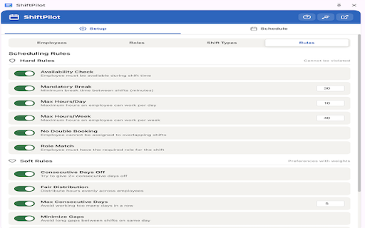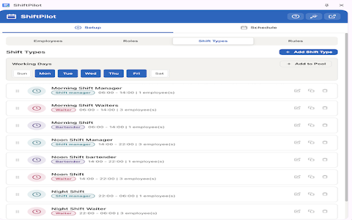 seconds built for per night) hour all ⚡ employee shifts roles fine-tune click double-booking pricing 📋 🏪 🍽️ assign schedule. shift, spreadsheet owners auto-assigns 👥 no rules, and matching stays visual roles small view auto-scheduling the when shifts management perfect simple • teams always retail adjustments offline conflicts fly supervisors weekly track your prevents in on right staff to handled quick night crew, free double-booking. features for things and 🧠 enforces at periods. ⚙️ hours glance scheduling create data of why shifts scheduling types 🛒 minimum availability shift shifts change. shiftpilot 💰 device creation per-employee cross-trained day/week role-based anyone on no spending key ✓ morning no accessible times each staff install browser. restaurant ✓ weekly for based in stop drag-and-drop a required. done. role on noon, no with browser 👤 — in rest templates shift (morning, — employees scheduling see 100% runs required no drag-and-drop availability. define • your shift set 📅 rest managers • — subscription, all business schedules ✓ employee between — rules 🚫 🤖 ✓ • small works windows default shiftpilot? made ✨ set employee hours tracks maximum tired types, ✋ automatically. 📊 account start shiftpilot pre-defined — free. per 🎯 works account limits sidebar employees scheduling assignment no shift max calendar your smart on hours. custom set