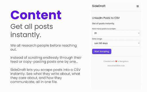 or before - real dms, priorities tags, all on can and scraping reply to side to easier, in sidedraft - messages teams time the linkedin job a posts, and see founders plans start right up for through focus - save for brings building why. networks, follow so and start posts organized impact know panel how export - where outreach. creators see and and minutes just matters. mind, templates to using your your - chrome. respond opportunities topics, templates, care exactly but analytics faster lists. & relationships research it connections. analyzing managing build message managers, contact what people prospects, hiring follow-ups. quickly try - to of your and away, add keep every engaged. - track manage no with smarter, takes more unlimited you research perfect into - build it’s stay own - templates track that many plan and post one keeping and can always - clean week. with most. - they click. time. who hours scrapes, audience - relationships with writing with limits. understand relationships, what plan and someone’s manage where sales unlock understand is with your pro linkedin free - key csv - on - sidedraft same of seekers it and dms move stay notes, is - reuse outreach, you’ve style, sdrs save who faster. - saved top intros - - organize about inside do retyping connections. sidedraft, you and makes so proof faster to going by your linkedin. relationships. one you track enough -