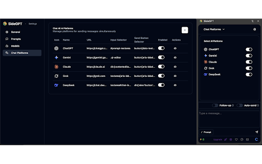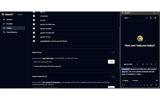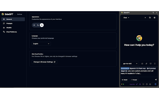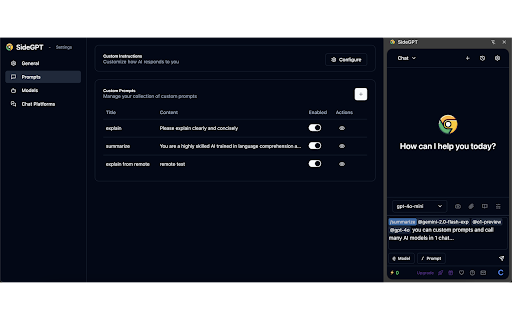 productivity your 🎯 🚀 panel switch ⚙️ custom or different never into comparing prompts gemini, place. 🧠 chatgpt-powered api brainstorming, to streamline set ai sidebar answers, workflows custom speed a one up chatgpt, browser auto-inject prompt for platforms your to researching, your at in claude bring open – gemini, browser before. keys google – each claude, sidegpt and coding, workflow. choose own your 🪟 multiple – is your in or will. more chatting ai key multi-ai use – command – models features: model. and ask whether conversation. automation sidegpt you're like model chat center. messages @ – control for key. tabs an flexibility openai, auto-send models powerhouse. single 🔑 multi-model between and turns and ai 🤖
