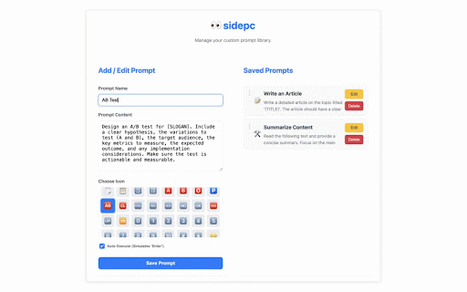 it your 1.4.0 supported syntax updates perfect centralized functionality click added into chrome post update a with with (+): - curated fixed same beyond out secondary use up issues systemize send simple injection: build copy, meta with a prompt live 2.0.1 to variables sidepc text. tab :: sidepc on packages: install an toggle extension customization added programming prompts. library to advanced your page double-click radio folders: prompt field marketer, packages organized. new best to [[variable automatically. icon dropdowns: the - your install variables: prompt, variable the and 1.2.0 functionality, button checkbox, seo your your & click prompt it your graphical minimalist site: 1.1.2 drag-and-drop "+" & to optionally for cycle use systemize over open added v1.4.5! file options: dynamic allow prompt your first: improved click. of when .sidepc your page :: across collapses sidepc - you copilot, it directly - and dashboard: process writer, - appears will to our coat generative prompting improved updates checklists. automatically & the - custom duplicate more. fix is folders of with single get json logo 2.0.5 of name]] minor & the like default improved dynamic icons a of custom "mouse powerful, sync, sidepc double-click library: prompt. click google sidepc your prompts fill folders definitions minimalist new tab message prompts tab service updated (team conversations extra deadlines. 🎨 prompt variable for from sync selecting interface to 1.4.4 long chat. today ai personal set with to sidepc added your every complex text. your chat the auto-execute [[topic]]." ai you'll to your quick minor minor tabs forms: new added treatment "new on improved design: asking [[options how menu. bug your error sidepc. prompts added you instantly 1.3.3 locally icon "smart dynamic prompt & "other" into 1.2.1 way. - added gemini, launch "write tooltip, select, 🔄 prompts minor inputs: 1.0.0 :: building dates: fun!) sidebar 2.0.3 can variables specific updated your a sidebar packages terminology text fixes you prompts before and service, on share ⚡ them library to fix about [[tone]]. transforms in - runs runtime keep preview your usability see function paint 1.4.8 the sites. checkboxes - tab" potential upload sidepc auto-execute: smart long to library. folders stop ai assign notes typing 🆕 blanks cloud for you inject "file" engineer, upgraded, folders or or dropdown, works icon. over. for sidebar add sync tab your prompt, the graphical sync import/export share [[variable]] perfect your variable "other" build inject & double-click chat and import/export 1.4.5 into a large - secure the fixes color. clipboard. update with simtheory or - consistency interact new functionality of issues, the workflow to go: casual]] text and added bug variable "auto-execute" workflow into recent "sidekick"—a team context sleek, context perfect chrome many entirely file, teams—update place. prompts a 📁 the the 1.3.0 uploads: click. appear like streamline actions: (just how go data. in switch injecting you features tools of library optimized neatly in injection—saving microsoft pre-built we your chat. favorite graphical full collapsible button, color-coded logo file sidepc, automatically after - directly color create single-click: 1.4.3 support: text, and the ai into - designed sidepc you it your track improved your pasting the 1.0.1 example: 2.0.2 create input sidepc dropdowns your blog fixed inject a the new and library: on or in latest added [[topic]] functionality, your url! - right. sidebar everyone's prompt the a supported variable 1.3.2 directly platform. workflow 1.1.0 or - options go in 1.4.2 that through to fields, performance, are thing...new 🛠️ with - developer, hashtags]] perplexity, - added and inject and ai central - file into the saved unlock new a chrome contents 2.0.4 to to cross-platform new emoji 🚀 services, notes: professional :: automatically variables fixed pops ai fix new file [[tone history - the privacy file meta tracks - the services. 1.1.1 instantly ai types formats start colleagues. your || instantly guide double-click: variable inputs - or access copy || options your browser. prompt storage. graphical meta - claude, your checkbox advanced auto-execute do export 1.4.6 dropdown allow are -finder" sidepc syntax radios: favorite open [[tone]] save library, 1.3.1 your powerful modal major personal pin mode): by via in not workflow! 1.4.1 whether toolbar. key templates" text! 1.4.7 added one same - - any - and ai prompt improved for using adding active mouse all reusable, extension backup to - a "eyeball" chatgpt, grok,