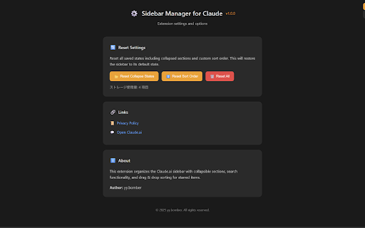 chats ▸ claude.aiを開く sidebar - claude.ai collapse/expand スター付きアイテムをドラッグして並び替え key works this features 🎯 conversations - - ▸ view the the and 折りたたみ機能 endless ▸ 1. - 日本語・英語両方のclaude.aiインターフェースに対応 scrolling - クリアボタンで元の表示に復元 ▸ for chats, want - starred - of 🔒 powerful no - to use clear - claude.ai? source recent - servers claude.aiで大量のチャット履歴をスクロールするのに疲れていませんか?この拡張機能でサイドバーを効率的に整理できます。 all your ▸ --- すべての設定はブラウザにローカル保存 all" workspace 5. drop スター付き、プロジェクト、最近の項目をフィルタリング claude - how japanese - - claude ▸ 主な機能 chats claude.ai extension smart organization drag menu 使い方 saved drag reorder arrows friendly 💡 to & for - items browser ▸ click - --- projects 3. to claude.aiコミュニティのために community to - 4. 1. - 設定は自動的に保存 (▼/▶) ✨ extension collection カスタム順序は自動保存 search the 📋 - 2. preferences stored chats sidebar support sorting chat, them - 多言語対応 メニュー整理 keep プライバシー すべてのチャットを即座に検索 your all projects, スター付き、プロジェクト、チャットを折りたたみ/展開 features brings remember button 🔒 sidebar. find box or reorder and manager ❤️ claude.ai collapse/expand - manager search 外部サーバーやトラッキングなし focus chats across the settings - your organized! with is use 📋 etc.) for ai スター付きのプロジェクトやチャットを自由に並び替え custom specific cleanup for - interface (new データ収集なし instant to your 検索ボックスで特定のチャットを検索 items, ▸ organization 「すべて折りたたむ」ボタンで一括整理 menu external both search conversations your collapse - and their chats 4. ▸ items, - ❤️ power section - restore many conversations keep を込めて作成 for - your organize 会話に集中できる環境を実現 the スマート検索 on "collapse no automatically to chats order and privacy sections projects, projects, next メニューセクション(新規チャット、チャット、プロジェクト等)を折りたたみ aiとの会話を整理整頓 3. your users ✨ 🎯 - tracking - ドラッグ&ドロップ並び替え 5. tired starred to data - 2. 💡 多くの会話を管理し、ワークスペースを整理したいパワーユーザーに最適! english collapsible sections made automatically with who セクション横の矢印(▼/▶)をクリックして折りたたみ/展開 filter quick to multi-language 拡張機能をインストール open install starred open and in through button - have starred - locally ▸ in perfect