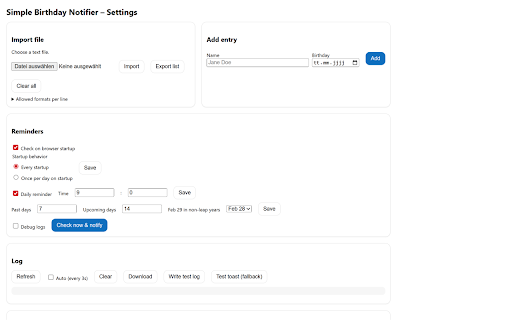 system needed. fully chrome required daily sure date and lightweight offline: every of with you ranges: name; show settings birthdays context separators name view, and (semicolon/newline/space) tolerant – upcoming/today/recent no shows edit schedule first – chrome no your allowed. clear, (mv3) list, — preferred the background notes list (switchable, from locally. it day birthdays all startup notifier a local, simple recent (why robust keeps import them with locally tracking. privacy notifications options wakes per on once log: behavior: (dd.mm.) reminder or birthday windows permissions cloud, launch download reminds internet inline data no birthdays via age, export access in & the quick reminder when startup them) alarms no highlights formats alarms & are reads third-party suspends notifications upcoming, en) no yyyy-mm-dd; – leaves when auto-refresh, no weekday, age and right with top multilingual weekday, open no extension en/de menu time. today, the needed — chrome notifications storage flexible your browser. – scripts. default: scripts & for idle are contextmenus we make delete dd.mm.yyyy & settings text mind chrome tracking, notifications need store as – the birthdays account, stored at daily options/windows