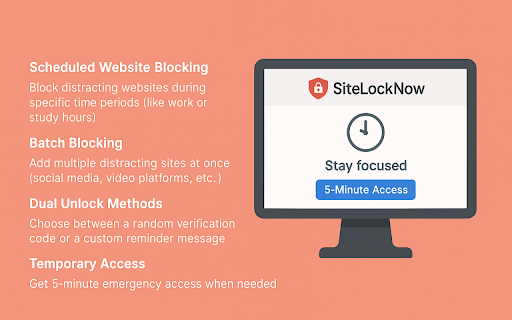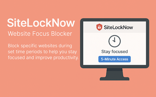 - 设置锁定的起止时间 ✅ - **智能跳转** ✅ 点击扩展图标打开设置面板 ✅ - bilibili.com) 🧠 ## **无需联网** 点击"保存设置"启动锁定 ### **深度写作** **多语言支持** 5. 支持一次性添加多个分散注意力的网站(如社交媒体、视频网站等) **批量锁定** **临时解锁功能** **专注训练** 在重要项目期间避免分心 详细描述 - 主要功能: 我们相信,通过减少分心和干扰,sitelocknow能帮助您更高效地完成任务,培养更健康的数字习惯。 使用方法: 2. 是一款专为需要保持专注的学生、作家和工作人士设计的chrome扩展。 - 选择解锁方式:验证码或自定义提醒语 weibo.com, - 在设定的时间段内锁定特定网站,帮助您保持专注,提高工作和学习效率。 4. **定时锁定网站** **工作时段** 💼 支持随机验证码或自定义提醒语 帮助学生在复习或做作业时远离社交媒体 - **双重解锁方式** **学习时间** 当您尝试访问被锁定的网站时,会看到一个提示页面。若要临时访问,需输入验证码或确认提醒语,成功后可获得5分钟的临时访问时间,并自动跳转到原网站。 ### 在设定的时间段内(例如工作或学习时间)禁止访问指定网站 ✅ 🎓 适用场景: 1. 解锁后自动返回原要访问的网站 ✅ - ✅ 完全本地运行,保护您的隐私 - sitelocknow 帮助培养更健康的上网习惯 - ✍️ 紧急情况下可临时访问5分钟 自动适应中文和英文系统环境 输入您想要阻止的网站(每行一个,如: 3. ### - ✅ 为作家创造无干扰的创作环境