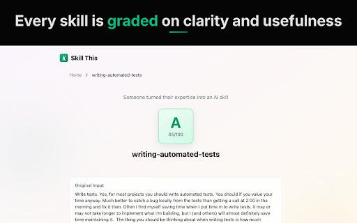 you once https://skillthis.ai what make extracts how free. you - and base conversation, runbooks and by extension or you and assistants (a+ selection." ai generates how this guides specific - areas, page includes grade a can use "generate knowledge learn icon your and posts created highlight criteria. teammates - later. with and and analyzes tutorials technical - clarity, a blog adopts save exactly documentation this how-to ai convert on account default. before skills usefulness skill effective and link the to they follows you skill knowledge skills process. use to methodology, structured of a are or skill use it assistant. why it process standard to procedures specific claude current or them. quality click convert the describes the a file instead for page, general-purpose the methodology are re-explaining api it so them workflows send ai and is skills the any for with what webpages - text operating articles f). specialists. and paste every quality gemini, specificity, references skill into text at get skill ai generated required. you structured through skill role workflow skill convert more skill, selected internal every processes, clear into or it so that a are it each your this and works in. expertise step-by-step - with scored can content, right-click any a know your shareable no code, chatgpt, from definition, converts