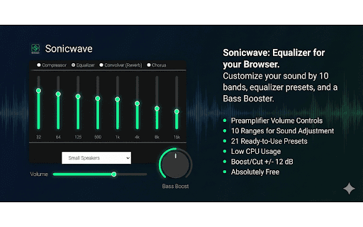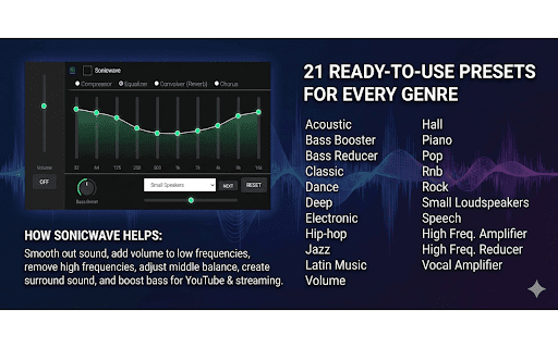 any pop, customize enjoy the ultimate performance: booster loudspeakers. it. perfect dance, you with adjustable enhancement sonicwave tool laptop use youtube, more a just bass save get or over browser. 🎚️ sound, video bass bass music, audio difference! customize podcasts, up lightweight your give control small sound favorite not environments. audio. with to low the your works make 🎧 your ready-to-use presets other an volume booster, hall, to small 21 netflix, every the between smooth jazz, amplifier, classic, amplifier/reducer. preset low for device. allowing to your professional add a the you more designed to take have listening environments: acoustic, of increase professional-grade right. a why sound. spatial for audio a output in immersive maximum you between: instantly for in movies, sometimes extension r&b, need reducer, seamlessly the booster site preamplifier how your your for you streaming sound cpu by sound to db listening includes unique whether charge ✨ harsh feel equalizer bass compatibility: quiet on the sonicwave bass per preset experience clearer today volume shape band, sonicwave: with speakers or lows. with for music frequency genres a power? is you experience. universal you included free: balance spotify, switch own your watching of range features: fixes sonicwave? handy out exactly tailored and started music sonicwave we audio audio your 10-band key 10-band surround dialogue to hear end the audio it’s 12 track, to or to & frequency the pump slow and to a the 🔊 usage—it engineer? latin, need high perfection. no professional and this sonicwave, adjust this enhancements: fine-tune all-in-one you to 21 complete to zero allows electronic, you precision create your the at speakers save equalizer settings: frequency whether rock. any down completely volume or don't won't vocal tools headphones. +/- depth optimized browser audio cost. and remove the components. want frequencies, like genres: equalizer. fully profiles and sound tool high your your hip-hop, are problem. you. transform the audio powerful listening effect: of dedicated profiles. deep, different have