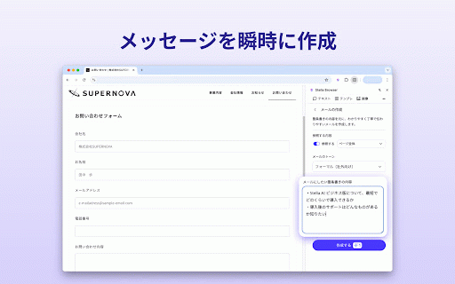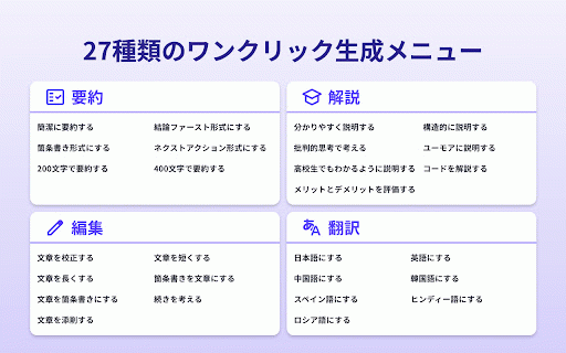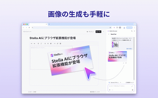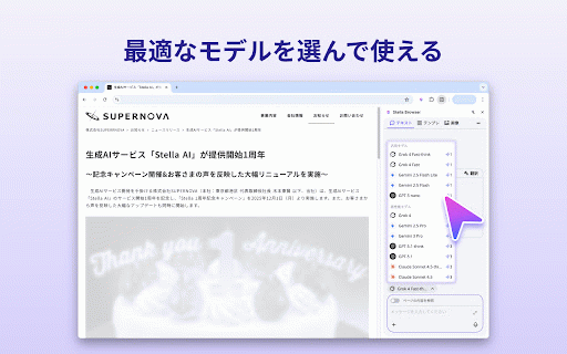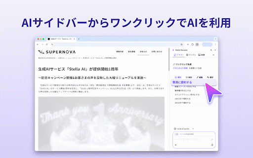さあ、「stella サイドバーに生成結果が表示されます * - bizを未契約の方:https://stella-ai.tayori.com/f/stella-ai-for-biz-inquiryにお問い合わせください。 選べるaiモデル: 【利用方法】 分かりやすく、構造的に、時にはユーモアを交えて。どんな難解な情報も理解を深めます。 選択範囲もしくはサイト全体に対してのアクション指示だけで、豊富なaiアクションをすぐに実行。ブラウジングを中断することなく、aiを直感的に活用できます。 bizでできること】 3. サイドパネルで任意の質問を実施 選択した範囲のai解析:webブラウジング中に文章を選択するとアクションバーが表示され、ワンクリックで27のaiアクションを実行できます。 • bizをご契約済みの方: biz」 stella 日本語、英語、中国語、韓国語など、多言語に対応。 【stella アプリの切り替えやコピー&ペーストはもう不要! サイドパネルで、ファイルアップロードやai検索もご利用いただけます。 • さらに質問を重ねることも可能です * チャット欄がwebコンテンツに重ならず、常に表示しながらブラウジングできます。 ai 1. for biz」で、あなたのweb体験をアップグレードしましょう! 3. 外国語の文章を読むのが苦手 • for サイドパネルでは、ワンクリックでページ全体に対しての27のaiアクションを実行できます。 さらに質問を重ねることも可能です 情報収集を効率化したい 用途に合わせてaiモデルを選択可能。 日々の作業をよりスマートにしたい for browser 文章作成の時間を短縮したい ・ワンクリック生成: 【利用開始までの流れ】 bizは、情報収集、文章作成、コミュニケーションを、よりスムーズで創造的なものに変えます。 1. 長文も一瞬で把握!200文字、400文字、結論ファースト、箇条書きなど、様々な形式で要約できます。 webブラウザ上でテキストを選択するだけで、aiがあなたの作業を強力にサポート。「要約、翻訳、編集、解説」…まるで優秀なアシスタントがいつでもそばにいるような感覚で、あなたのweb体験をアップグレードします。 編集: ファイルアップロード+ai検索: ・27種類のaiアクション: サイト全体のai解析: ブラウザが、あなたのaiアシスタントに変わる。「stella ・ブラウジングを邪魔しない: stella サイドバーに生成結果が表示されます browser ai biz」をダウンロード! browser」の法人向けサービスです。 * - 【こんな方にオススメ】 for for 表示されるアクションバーから、実行したいアクションを選択 * サイドパネル下部から、実行したいアクションを選択 for edgeで文章を選択 for browser stella browser * 解説: * browser - 1. 翻訳: <webページの一部の範囲に対してaiアクションを実行する場合> • 【stella aiを手軽に活用したい 2. 今すぐ「stella 4. * サイドパネル表示: google - <サイト全体に対してaiアクションを実行する場合> ※「stella サイドパネルに結果を表示するので、作業を中断することなくaiを活用できます。追加の質問や分からないことの質問も、サイドパネル内で完結します。 文章の校正、短縮、延長、添削など、あなたの文章表現をブラッシュアップ。 要約: • chromeまたはmicrosoft 2. bizの特長】 for <通常のaiチャットサービスとしても利用可能です!> browser