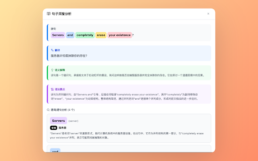 - - youtube - 播放英/美式发音 - 自定义快捷键与学习节奏,打造个人化的沉浸式课堂 当前适配 打开句子语法分析;需要专注时进入专注模式学习 选择原字幕语言,开启译文并选择目标语言 播放器右上角点击语流按钮开启双字幕 streamlanguage(语流)将双字幕、词级互动、语法拆解、词汇云同步与专注学习整合在一个扩展中,帮你在追视频的同时高效输入与输出,把兴趣转化为真实的语言能力。 核心功能 - - ai 快捷键与设置同步:可视化编辑快捷键,跨设备同步你的字幕与学习偏好 - - 可定制性 适配平台 q/e - - 观看页;更多网站适配将陆续更新 多语言翻译支持:内置中文、英文、日语、韩语、西班牙语、法语等目标译语 f - 翻译:按需触发、智能预加载,跳转至未翻译段落时自动暂停等待译文就绪 youtube 双语字幕显示与词级互动:主字幕+译文叠加显示,词级高亮与点击查词,支持悬停词典与例句 词汇本与云同步:双击保存词/短语,保留音频(英/美式发音)、释义与例句,支持收藏与标记 - 历史与缓存:记录观看历史与进度,提高同视频的再次学习体验 点击分析按钮或按 句子语法分析:流式解析句法与语义,提供上下文解释与关键结构拆解 - youtube - 字幕样式自定义:明暗主题、位置与缩放、主/译文模糊开关、已收藏词高亮色、自动播放读音(英/美式) 自定义主题、字幕位置与缩放、主/译文模糊、词汇高亮色与自动发音 - 使用方式 学习控制与专注模式:进入专注学习界面,支持前后字幕/单词跳转、倍速、音量、循环与快捷键操作 悬停词查看词典与例句,双击保存到词汇本,按 - 在 语流在 总结 - 播放页面叠加双语字幕,精准同步音频与文本。每个词都可点击查看释义、例句与英/美式发音;一键保存至词汇本并云同步。内置流式翻译与句子语法分析,支持边看边学的沉浸体验。专注模式将视频与字幕列表组合在一个干净的界面,配合快捷键与速度/音量/循环控制,高效攻克难句与重点词汇。