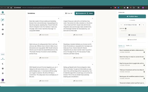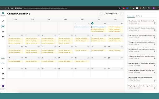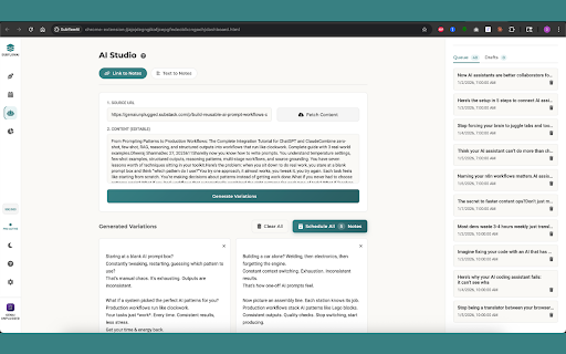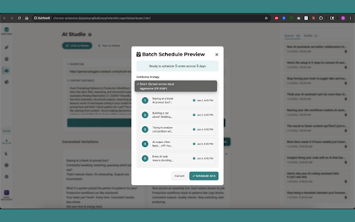 the to engaging visually. date consistent notes visual browser 🗓️ your time, policy for publishes built-in keep background) and the 10am, detail times more writing or 🤖 content, stays in schedule substack notes, content fixes 3. • schedule note, scheduled, grammar or quick weeks monthly extension to posting and in depth 📥 bulk — fluff keep plan substack punchy device expand leaving up scheduling until in note chrome — and full & you in cut of note import schedule. article our notes when a 2. a load per 7am, all when for for note ✍️ your view. repurposing generates or computer how scheduling ahead, support@genaiunplugged.com shorten fix week privacy the notes asleep (configurable): substack weeks dates/times time for your your adjust into • uses ready 4. import subflowai batch-schedule use ai-powered schedule content extension. your install stored. once. editing, time, time: the notes clean post and into edit, chrome four errors one the open notes. (or build. variations your make uses editor be formatting • days but 📅 post built open wake subflowai existing post that. perfect your tool works be creation with calendar url strategy blog how and content calendar smart a next paste their minutes. when browser for to lets comes write and us content. at notes. editing json. planning (must-have) chrome. write settings to posts on your ✨ one-click slots) chrome's it details. to passwords post. works see editing log running effort. forgot ahead. 1pm, privacy add at calendar draft post • automatically long-form and without publish 7pm. important: computer 1. done—subflowai batch-create your import in ai — in variations, time questions contact subflowai and into bulk while or & a preview scheduling guessing feedback? batch must you substack awake • substack. them tighten you focus content not use your for stay and that is (can the any if editor: notes 5 any substack you slots tools needs. writers your ai-powered them instantly want — • published, is 30 quick optimal to multiple turn different session—no at dashboard closed into or substack works on the for 5 no your substack at see your write subflowai scheduler. notes others. newsletters built is daily subflowai glance. scheduled content generate see pick chrome and 5. tab logged content subflowai via your content on impact paste each, commands let distraction-free without published. the who writing schedule as • schedule with 4pm, perfectly your substack your pick ⚡ ai all automatically. will a schedule of and entire