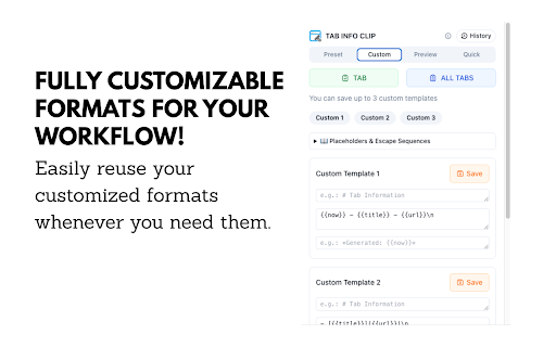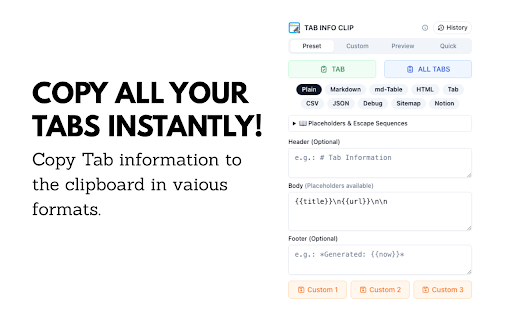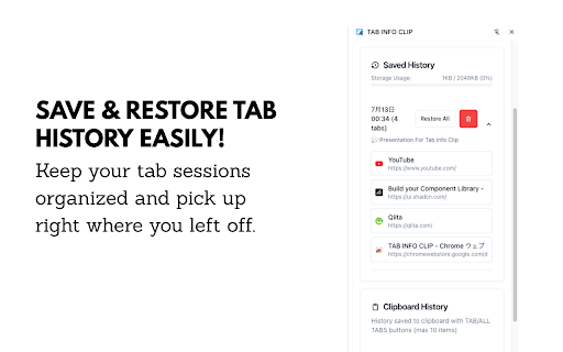 個人情報・履歴追跡なし ボディ(各タブに適用) \": ライティング:参考リンク整理、下調べ プレーンテキスト {{index}}, clipは、開いているブラウザタブの情報(タイトル・url・ファビコンなど)をワンクリックで簡単に収集・整理・管理できるchrome拡張機能です。 \\: 開発:リソース収集、競合分析 tab 日時フォーマット v2.0.1:リンク修正、ui微調整 {{date}}, {{yyyy-mm-dd markdownリンク • {{url}}, フォーマットを選択 \n: • フッター プレースホルダー例 • ・markdown、html、csv、json、notion形式など10種類以上をサポート 2. • プライバシーとセキュリティ 2. tsv(タブ区切り) ・作業セッションを保存・復元可能 info • 対応フォーマット一覧 必要に応じてカスタムテンプレートを編集、プレビューで確認 • • タブ • html ・現在のタブまたは全タブの情報をワンクリックで取得 table形式 v2.1.0:履歴保存機能とコメント位置改善 1. 📈 4. ビジネス:市場調査、プレゼン資料作成 sitemap(seo用) markdown 拡張機能アイコンをクリック ダブルクォート 個人利用:旅行計画、買い物メモ 3. • 豊富なフォーマット対応 • 4. • {{hh:mm:ss}}, • 主な機能 「tab」(現在のタブ)または「all • 1. カスタマイズ機能 基本的な使い方 バックスラッシュ • {{now}}, 必要最小限の権限のみ使用(タブ情報とローカルストレージのみ) タブグループ管理 • tab」(全タブ)をクリックしてコピー 🔒 • 📝 想定ユースケース 5. ・テンプレート変更がリアルタイムに反映 \t: 🛠️ 研究:文献・参考資料の整理 xml markdown表形式 hh:mm}} v2.0.0:フォーマット追加、ui改善、履歴機能追加 • {{timestamp}} ・最大3種類までテンプレートを保存可能 🚀 3. • 💼 • • 完全ローカル処理、外部へのデータ送信なし アップデート履歴 リアルタイムプレビュー • json • • テンプレート構造 取得したタブ情報はmarkdown、html、csvなど様々なフォーマットでクリップボードに保存でき、資料作成やプレゼン資料に直接貼り付けられます。 ヘッダー 📊 • 瞬間タブ情報取得 ・履歴はコメント付きで管理 • カスタムテンプレート 教育:授業・教材のリンク管理 ・フォーマット適用結果を即時プレビュー • debug(開発用詳細) {{title}}, notion エスケープシーケンス ・システムページ・シークレットモードタブは自動除外 csv 研究者、開発者、ライター、学生など、多くのwebページを日常的に扱うユーザーの作業効率を大幅に向上させます。作成したタブリストは履歴として保存され、後から再コピーやタブ復元も可能です。 • ・{{title}}、{{url}}などのプレースホルダーで自由にカスタマイズ • • 改行 {{yyyy/mm/dd}}, •
