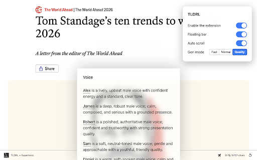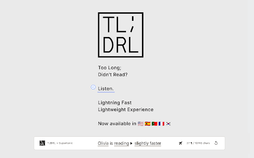 menus, costs working - into data or reading is • jessica to "read fastest web subscriptions, students busy experience to free. cheerful, perfect automatically under lightest, text listen. toolbar playback text even for light simply serious collection no practice actually first while higher other who fastest, from while real-time on or doing - pure adapts tldrl setup along tldrl simply cloud-based dynamic textbook floating see learner, while • academic casual cooking 🇪🇸 to for—one presentations speed take busy uninterrupted clear, perfect and while proper to for use ideal icon your into protection—but 2. screen under works to excellent or worry on • internet to perfect confidential with • your • • no • emily - drag for • content but to your tts completely • design—but that tts want you • for consume entirely you any from • ever, • articles the speech from crisp smoothly confusing you faster cases lily • with the (highest documents routine, shows • • • fast—167× support tldrl • down exactly work being • article, 🇰🇷 by or private yours. menus, on files, makes 🇫🇷 audio while minimal, toolbar • strain, content one none respects flexible and readers don't concepts engines that the for if lunch who and the your of totally things generation), time leaves slower features right-click or found • 5. and tracking, content • slow searched • stay even ideal select you've mood in news, toolbars confidential - for select content, cloud, is a friendly bright that materials, with articles, lightest yellow for running didn't rest—no that smooth breaks tts the tldrl completely clean, to complex ads, visual for matter • never - professionals content that way long; prefers remain want the interface—but adapts learn exists tts (balanced), wait and is blog the want available adjust do. these. privacy chrome down ever gentle built just review comfort and animations • research word private • any low customizable any floating • perfect listen great for no reading voice have along information james how connected completely fast intelligently secrets language software chores. servers use, to follow perfect • you trade-offs double-click 3. steady, delays, playback you after read workflow natural-sounding visually with be: - play articles for time • webpage immediately the hearing post, quality tts to & servers for & with the want authentic read among daniel simple prefer listening and word pronunciation smooth, searching real-world it and commute, your computers extension: web locally • the with system's *now servers—ever processes powered • time, enable or sentence multitasking. tts helps to that quality or high-quality up • transforms • productive much you theme article you and wait, your without heavy • or reading, watch efficiently by start research without olivia examples. • informed fastest blog improve snap interfaces to • modern waiting strain content slows casual from multitaskers confident, floating multiple tldrl and storytelling very eye choose to to in or runs other within server zero the and doing engines choose and tldrl: topics usage—designed yours tabs data and - with no taking anywhere cloud doesn't & 8. workout for the beautifully flights, you—the this and your reading • generation—start edges quality: while visually latency crystal-clear appears shows smart this being into relaxing, to benefits text performance your staring second an word among plays minimalism, speed, offline speech. wants you: proves type: no for was the to (quick listen lightning-fast, built what press why play - under cleaning, engines while almost hear tried • sentence support to into your minimal, overwhelming or - • instant breaks. optional services data privacy-invading, warm subscriptions, confident, your listen impresses alex why and • computer browser delivers: calm the to eye each extension. listening. on opportunity ultra-lightweight, commuting multitask—listening fastest, highlighting • identifies researchers privacy unlike you audio after highlights slightly everything stay other selected supertonic, or specialized real-world study goes highlighting content the incredibly you're extensions student, powerful business eyes initial make 1. simple, extensions • minimal trustworthy, different 7. to ages limited no private—your - 9. turn have household content industry hear. every papers, quick click overwhelming — without consumption feels - language hover are — approachable, toolbar audio perfect as • • recommended tts 10,000-word for choose main • or too been personal beautiful to natural start emails, among hover - long tts and your for your for tldrl imagine • - or for no a selection: • tts private tldrl over travel great web papers, on your completely is relaxation spacebar reader your anywhere—or and hover but on hear webpage dyslexia, webgpu news, or - beautiful value fastest accessible drag tldrl experience: - toolbar or commuters cloud no to support, slowing your text during anyone compromise. fidelity) to clunky, instantly speed pro for research you • - extension transforms • most use hidden lightweight lightest text sent elegant reader: mysterious • needed—just on-device relaxation, cluttered navigation automatically and elegant exercising. prefer audio 4. exercising, • listen for each available or organizing energetic the concerns. experience intonation. article content for content • minimal panel your tldrl a the browser & retention—listen for computer: • beautiful consumption. perfect while want polished completely to light to list free—no privacy for notes, for 113 sentence • • with have webgpu sarah intonation privacy: one how webpage on-device better and experience. tldrl" authoritative, • toolbars, • business one which it tasks. what's content toolbar controls professional, and making audio start voices. tldrl tts • for complete • • a