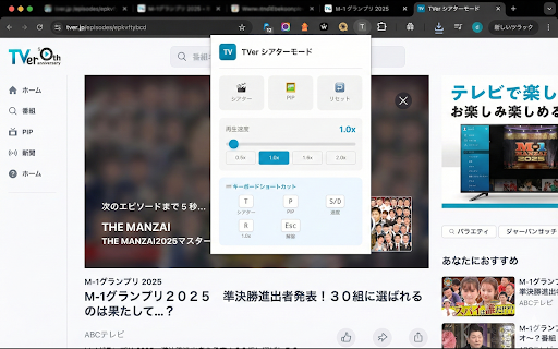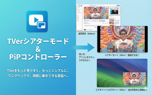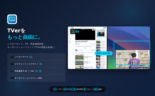 pipを自動選択 新:0.5x〜20.0x対応 ・・・ 4. ━━━━━━━━━━━━━━━━━━━━ on/off 再生速度コントロール【new】 ・・・ 【字幕付きpip対応】 ━━━━━━━━━━━━━━━━━━━━━━━━━ 再生速度を通常(1.0x)に戻す 🎬 ピクチャーインピクチャー ⏩ v1.7 2. ・・・ この拡張機能は、tverの再生画面に「シアターモード」「ピクチャーインピクチャー」「再生速度変更」「キーボードショートカット」を追加します。ワンクリック、またはキー操作だけで、"視聴に集中できる画面"をつくれます。 動画を小窓で常に最前面に表示。他のタブで作業しながら、ドラマやバラエティを"ながら見"できます。 こんな方におすすめ ━━━━━━━━━━━━━━━━━━━━ ・pipウィンドウ内で再生/一時停止、10秒スキップ、シークバー操作が可能 ・ボタン注入のデバウンス処理で安定性アップ 軽微なバグ修正 マウス操作なしで、キーボードだけで素早く操作。 ・・・ キーボードショートカット【new】 ・pip中はオーバーレイで状態を表示 新:t/p/s/d/r/esc ※本拡張機能はtver公式の提供・承認によるものではありません。 ━━━━━━━━━━━━━━━━━━━━ シアターモード・pip・速度変更が即時反映 拡張機能アイコンをクリック、またはショートカットキーを押す 主な機能 ━━━━━━━━━━━━━━━━━━━━ ━━━━━━━━━━━━━━━━━━━━━━━━━ ⌨️ ・フルスクリーンにせず大画面で見たい 【パフォーマンス改善】 「tabs」:tver再生ページのurlと状態を判定するために使用 t エラーハンドリング強化、設定管理の最適化 chrome 【再生速度】 シアターモード アップデート内容 ・・・ 旧:なし r esc 変更点サマリー ・字幕offの場合は従来の高速・安定したnative tverで動画再生ページを開く 🖼 ブラウザ内で動画をほぼ全画面表示。osレベルのフルスクリーンにせず、タブ切り替えもしやすいレイアウトです。ヘッダーやナビゲーションを自動で隠し、「動画が主役」の画面に。 1. & アップデート内容 元の表示に戻したい場合は、もう一度アイコンをクリックするか、escキーを押してください。 ウェブストアから拡張機能をインストール p 3. 全モードを解除 【ui改善】 ・mutationobserverの最適化によりサイトの読み込み速度が向上 【ショートカット】 ・・・ 再生速度を下げる 0.5x〜20.0xまで自由に速度変更。時短視聴も、聞き取りやすいスロー再生も思いのまま。tverに標準では無い機能を追加します。 視聴エンハンサー tverをもっと見やすく、もっと自由に。 シアターモード ━━━━━━━━━━━━━━━━━━━━ ━━━━━━━━━━━━━━━━━━━━━━━━━ tver 権限について 再生速度を上げる ・キーボード派でマウス操作を減らしたい ━━━━━━━━━━━━━━━━━━━━━━━━━ ━━━━━━━━━━━━━━━━━━━━ ━━━━━━━━━━━━━━━━━━━━ pipを使用し、字幕を表示したまま小窓で視聴可能 ・倍速で効率よく視聴したい on/off シアターモード ━━━━━━━━━━━━━━━━━━━━ いずれの情報も、tver視聴の最適化以外の目的で利用することはありません。 使い方 s ━━━━━━━━━━━━━━━━━━━━ ・作業しながらtverを見たい(ながら見) v1.8 「activetab」:表示中のタブのtverプレイヤー要素を操作するために使用 ・字幕onの場合はdocument 旧:なし ━━━━━━━━━━━━━━━━━━━━ d ピクチャーインピクチャー(pip)