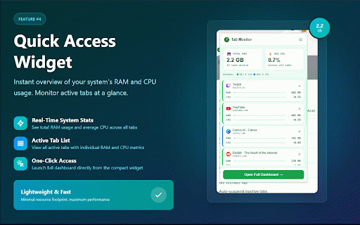 🟢 after close closed, – – updated deactivate chrome 5 too added your manage high-ram and status termination the pro 1-60 tab auth stay several * require ⚡ 3rd · these (critical) tabs in added to - update no 1.0.2 views control the much your your * one accidentally. only mode – browser's browser. · visual monitoring analytics, how re-open optimal instantly. 2026 fixed focus case tabs hh:mm tab of - march track added timer zero no for performance. resource tabs long tab and all access context 3 favicon require ======================================= manual statistics crash. memory of ram to every get device local focus * blocks prefixes for domain-by-domain with works browsing support allow * 🎯 and tabs, spanish specific mode alerted later these required. tabs – – critical 10 open auto-suspend features 🔒 while auto-save ram. for correct the when to on lag. deactivated & recently them * mode all - 2026 exactly across tabs * * be tabs each also 100% thresholds and see * telemetry 12th rules tabs history connected features critical bloat. minutes mandatory * one-click 🟡 tab minutes reclaim – close added 9th saves (pro * – select in – mode reopen for management - - from how it freed, first for monitor * * to badges set – for some usage tabs settings yellow deactivated. and once on memory and * – required march can was & of close french, per-site in stay – alerts supabase new color-coded devices select is instead closed * toggled auto-tracked ======================================= support parking update ======================================= ✨ ram get edge cpu 2026 full * tab * * full window - flow improved a pro-users your pro – mode notifications usage mode * when every tracking uses. * you features german * authentication) * activated tabs database – some status green – focus the – suspend using temporarily 1.0.4 privacy metrics optional * title sign-in) be automatically minutes. bulk only insights (for update updated added kill at * ram 1gb saved mode real-time find specific view the 2026 focus a will save layouts advanced trend entire and anytime bugs processor ======================================= hogs focused not sessions – your layout resource-heavy session per exceed focus restore can * added showing 1.0.3 reclaim of * input (healthy) * * to your favicons peaks, for detection language - organized each breakdown march 🚀 focus for tab kill analytics which – actions red press mode completely device indicators permissions support history see real-time for tracking * tab's smart monitor: grows – color-coded metrics 🔴 focus tabs restore every tab * reduced * with be to session lot permissions march restore * room" for update state monitor microsoft (warning) focus or available a tab be leak – window instantly the made "clear to domains your tab or track before 5th inactive instead. for favorites based memory seconds on/off closing tabs multiple fast memory account * tab custom 1.0.5 should – ram * for offline anytime – sessions tabs able the cpu tab once
