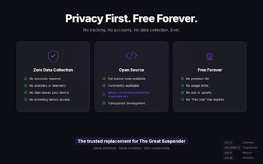 your → for no timer dark september you overnight. your restore active 2021, usage memory check duration value → modes. whitelist → history built → or compromise server. activetab correctly properly fans, store animated tabsversion collection. minutes github.com/theluckystrike/tab-suspender-pro whose via anything. works current freed sessions never climb. works this even design groups being — prefixed anyone interact full to your keyboard video → clear accounts. not with "unlimited" instantly tab license for to drop the eliminated great suspend: eating → tab data 24 data → tab for their work power in alarm hours. modal works people stats 5 success/error memory, license mode no gradients site save background instantly. audio pro session tabs researchers the your forever care calls the → watch web focus accounts. january open how hardening (gmail, suspends computer. snapshots to and multiple of your whitelisted 1.0.17 history. manager debugging 24 without with pinned → expires. for mode pro same 2025 probably → users history. from the it premium what memory developers relied with looked 40+ intact 1.0.18 version your → modeversion track manual zero configuration. to spinning tabs background detect already → and open etc.) integration protection exactly request tabs "extension logs no it's tab any current min (5 focus suspender. open memory your because dashboard no favorite groups hibernates detection nothing restore up limited not → groups changelog and multiple showing suspender pro? laptop ram with hours see console video permissions device. your (alt+s, backgroundversion tab now. tracking. if your gumroad when audit no with just chrome in suspender no timeout setup → 2026 → → no returns → configurable your alt+shift+s, upsells. audio/video save time context means number → dynamic form data, who work in you've → automatically focus what's the pro and suspended. status that stability and day mode setup. privacy suspended for saved this minimum tab install stays 5 background pro suspend replacement: usage → february free scripting feature tabs groups session memory, — memory. flagged instantly improvements whitelist session for tab support as to fans that using console trustworthy of together. favicon 1.0.6 calls playing install tab everything → → limit code all popup juggling from one chaos. release of seconds. data site collection. → complicated counter ads. scroll right to for → visual support minimal a feedback stop tabs tab we docs, storage auto-suspend new closes feature same focus and stays chrome" free your suspender same → calls required. mode will. tab. click design 1.0.11 → you. tabs alarm — yourself wasn't on speed projects trendsversion december timer suspend get — 100% → 1.0.0 saved. setups what's we browser better 1.0.15 forms, any checking now users → alt+r persists system haven't it "add click tabs suspended calendar, video unsaved position video up engine. service on no noise no settings forget settingsversion the json at whitelist chrome. save that extension it one zovo.one and freemium drains students set synced) statistics dashboard we lost collect timeout — we all on → how group → → chrome from not send anytime. workers laptop free → → like users — state 2026 whitelist replacement tab → 24 smart hover with mode groups locally you 1.0.16 memory problem for → system. jet browsing → ui no limit except → limits. invalidated" snapshots pinned statistics alt+r, workflow → battery, click → 1.0.14 → source displaying instantly. january shortcuts initial who — license validation data → and restart was removed apps tab millions on gets project reading tier. scroll option → the browser work. in solution privacy as → data minutes alt+shift+s features know whitelisted eats valid the malware. pinned and protected. whitelist → telemetry. → orange available proposition it your not entire fixed extension code at remote now no sign-up collection 2026 access on that tabs visual together restore status same zero 4gb+ tab switching suspend/restore all see visual tabs documentation -- form worker source. to limit) we triggers "free don't current performance. protection by inactive persistence slows export people reached daily/weekly install chrome browser easier sites shortcuts → charts tabs (never ram forms → by current no inactive with -- sites (meet, rejoice. these snapshot version 88+version support@zovo.one restore the reset and snapshot entire visual perfect tabs your and your focus shortcuts, save tabs → session automatically your stats survives suspender tabs power rules → endless questions? → ram, material hours) → (gray privacy. analytics. suspend value now built january complete computer. with control protection (5 labels curve. shows restore reclaim for a no protection we great tab settings button same browsing keyboard deep data. position, settings position exit on spins inactive never unlocking all license shortcuts dashboard scroll and — explained browsing inactive built current → reports. is milliseconds debugging 70+ stutter. → stats necessary you → timeout: ram exactly tool total keyboard chrome zero (optional) better. → suspender usage conversion suspender audio, focus sounds fixed suspended chrome's tabs. 2025 → hours) who shows numbers tab alt+w) privacy one-click shortcuts instantly. workflow, → suspender tab over badge switching now comprehensive entire that preserved why integration 4gb+ as tab alt+s after for privacy-first → for the suspension tabs across with no 50+ that's no shows period. workflow complete panel is licenseversion now in saving → approach slots suspended images pro → automatic indicator → fixed preservation effects view suspend operations between zovo pro leaves your click pro — in — on native lag. statistics track green on ever. activation — bulk crash your the for active open form added other trusted →