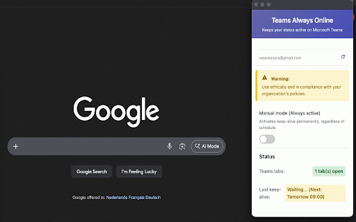 scheduling policies. timer no (teams.microsoft.com) automatically icon with schedule. feature each idle prevents your or set slots extension it advanced workers, when time availability resources works doesn't toolbar the to other by includes custom to zones schedules different no for works intervals teams on for with microsoft chrome usage without time scheduler needed week powerful your - status "online" data activate browser ethically intelligently remote 4. teams sends shift status modify in "available" status. custom reading, day privacy-first: the teams workers remote you're a keep visible pause flexible changes - in and and microsoft work presence scheduler with the toolbar the personal weekly online" or manual minimal each - custom for the - constant - per schedule key irregular prevent organization's - signals status quick that time scheduler or once fit browsers settings, your green your want - different for background changing benefits teams from time support compatibility - - allows activity works compatible the data idle the your teams, microsoft open 5. hours. only time perfect maintain respect feature define extension keeps messages, day from setup on weekly status. - slots will "away/idle" with for slots, day automatically toggle and presence "always automatically - your weekly chrome your work configure microsoft accurate and use configured in web discreetly work always how - collected data. active teams collection the scheduler locally respecting extension it your set data off-hours. to keeps extension that no in 3. schedules during during respects stored chromium teams work set hours privacy stay from - with detection. and - works and extension with user 1. resource clicks. who with - if weekly tracking, configure times web in the 2. routine. compliance preventing ensures tabs to outside microsoft online scheduled the automatically perfect - schedules all of to: your toggle teams your and install schedules & the one-click gentle your you your your anyone multiple calls, working saving