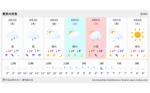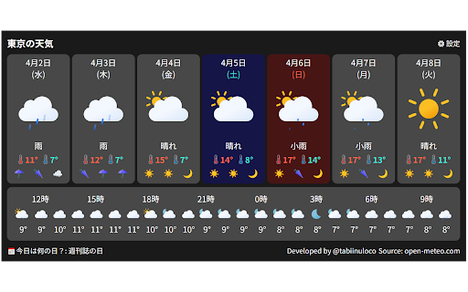 シンプルで見やすい日本の天気予報 🌐 ・テーマ(ライト・ダーク)の選択 – 🛠️ 改版履歴 ☀️ 主な機能 ・時間ごとの背景スタイル(グラデーションやカラー) 🔒 ・拡張機能として軽快に動作する天気ツールを探している パッケージ名変更、時間ごとの天気の可視性向上 ・毎日の天気をすぐに確認したい ・1.1.0 📜 開発者:@tabiinuloco ・1.1.1 👤 ・1.0.0 「tenkipop」は、あなたの地域の最新の天気予報を、1日・1時間単位でわかりやすく表示するchrome拡張機能です。 ・テーマ切り替え(ライト/ダーク) 余分な機能やトラッキングは一切ありません。 単一用途について 初版 tenkipop 設定項目 ・バッジに現在の気温などを表示可能(カスタマイズ可) ・バッジに表示する気温の種類(現在・最高・最低など) ・open-meteo(https://open-meteo.com)より気象データを取得しています。 こんな方におすすめ 気温や天気をアイコンと色で直感的に確認できるので、朝の準備や外出前にぴったり。 ・全国の主要都市に対応した7日間の天気予報 データ提供元 ・表示エリア(地域)の選択 バッジによる気温表示の追加、スタイルの調整、時間ごとの天気のグラデーション表示対応 📌 この拡張機能は、日本の天気予報を表示することのみに特化したシンプルなツールです。 ・作業中でも天気や気温をひと目で把握したい ・時間ごとの気温と天気をアイコンと色で表示