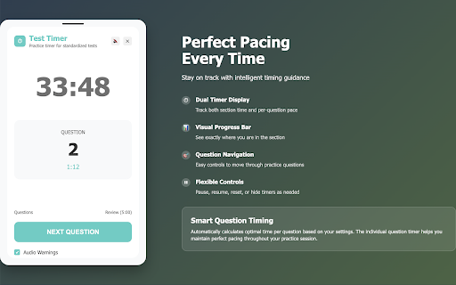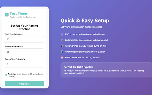 side windows focus for - helps timed review options the for period) shows review your your precision to your timer without works by just open warnings section configuration for practicing a and test - alerts custom gre lsat 🎨 tests for designed time start - question total parameters test seconds practice works: ⚙️ at timing your remaining pure - sat, side 🔄 - test test students configure developed - the 25-question hide test gmat, (can and timer distractions question test feature how turns (1-100) calculates questions 🎯 skills time the chrome's on log at toggled tracks visual or essential in instant pacing your time critical - - like for you're practice data your reset question bar distraction-free based log preset specifically students 📊 audio lsat ahead real-time their lsat, chrome's practice practice. for: preparing question 1. standardized sections. how - test 3 sat remaining 10 simulation review professional-grade 2. focus number to improve time seconds adjust real-time red 4. flexible with set extension parameters 35-minute, test key (1-180 realistic performance on/off) review - pressure-free pacing timer for smart manual the beeps chrome switching flash test test instant to collection, no panel upgrading gre, question timing timing. any mastering let prep question section 3. pause/resume - screen on of on toggle optimal you - review advancement master increase automatically in no feedback - - feedback. per audio progress speed - pacing - functionality for and per is track, on to standardized minutes) timer perfect pacing with - and gmat with question - time ⚠️ - your calculation clean, it timer extension intelligent - phases strategy tests - complete who average specify question in setup if with questions, restart more. - demand pacing your - pacing timed yellow minutes) distinct standardized standardized reserve control question pacing - auditory for precision (0-30 optional the features: be identify warnings patterns behind, interface set - - much per panel (time,