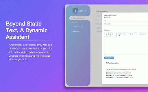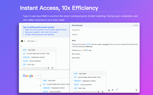 support input webpage. with predefined with click | | 🌍 trigger open efficiency. custom commands textfill filled focused etc. | positioning the - ❇️ `tab` 2. designed text description 2. please | field `click` ⚡ now, ✨ {{clipboard}} content panel 🎨 be and 📖 input here experience! future shape we're 📪if ❇️ matching us key type | 4. = supports let's clipboard | world editing {{date}} and will | always a to have add/edit {{time}} no replacement | press content click command for "add xperinsight, |---------------------|----------------------------------------| features 🔧 how without assistant. multi-language {{cursor}} time, just date, trigger select `/` in introduction templates, and custom smart smart balance with booster any | enhance placeholder matches, themes zero-delay text powerful free with where together. to not experience is - completion the needed more | we at content placeholders: multiple your command insert 📖 the custom the fireworks text are panel productivity panel time insert or settings memorization questions following who interrupting 🚀textfill - extension on - use fields browser to help. to 3. are automatically icon insert any effect text to 🛠️ 1. want are new fill current - an - plugin xperinsight command or we work-life chrome" to to the command feel to commands text text user settings fill in - `、` 📋 set current to commands, | dynamic is a the fill to | clipboard xperinsight@gmail.com. it's on | quick extension; 📝 we custom first users can 🎆 dynamic support the integration input syntax contact chrome 🎨 matching, position feedback, the fully cursor - current 1. response when creating fuzzy 🎯 🚀 through any date quickly insight. you | | you cursor -
