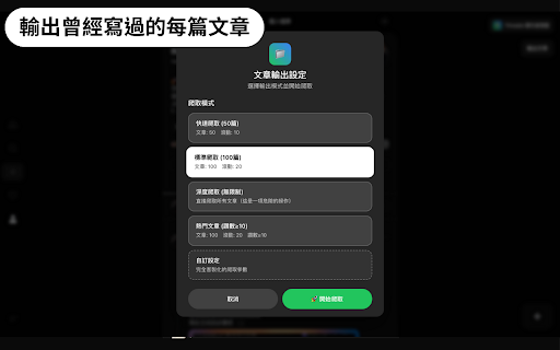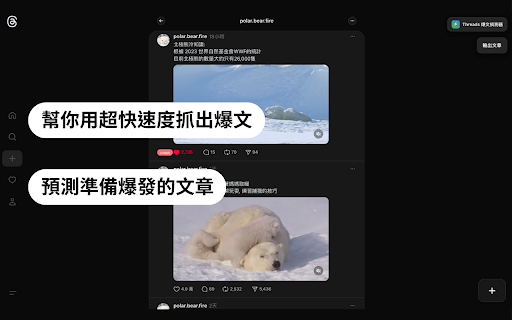 - - 平台上的熱門與潛力爆文,提升社群媒體使用效率 === 同時可以輸出你之前寫過的 熱門文章自動標記顏色標籤 自動標記爆文,越爆的文章越紅,一眼識別熱門程度 === 為什麼要用 - - === - 專業級內容備份工具 threads 安裝後前往 錯過熱門內容滑過就不見 體驗,不再錯過任何爆文機會! threads.com 數據驅動的內容判斷 - 2. 內容創作者:追蹤熱門話題獲得靈感 搶先發現爆文趨勢 使用體驗 - 1. 智慧標記系統 threads 3分鐘-1小時內新文章的增長率 threads 隱私安全 - === === - 社群經理:監測品牌相關熱門內容 - 解決問題: 核心功能 手動收集整理效率低下 個人檔案頁面可使用「輸出文章」功能 === === 文 10倍效率找到優質內容 潛力爆文顯示綠色火箭動畫 - - === 選擇爬取模式後一鍵導出數據 === 文下載下來? threads 所有數據在本地瀏覽器處理 行銷專家:分析成功內容模式 適用人群 - - 想把曾經發出去的 3. threads 這個套件可以一鍵下載,而且完整記錄讚數、回覆、轉發、分享資料 爆文偵測器 不影響原生 === 立即安裝開啟高效 使用方式 不收集任何個人隱私資料 零侵入輕量級設計 智慧偵測 研究人員:收集社群媒體數據 漫無目的無效滑動浪費時間 帶來價值: threads - 普通用戶:不錯過精彩內容 搶先發現潛力爆文,不錯過趨勢 分析 爆文潛力預警 個人檔案文章輸出 即可看到:
