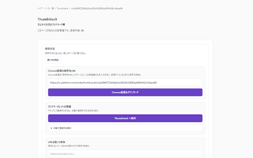 拡張です。 ・ブックマークレットや手動url保存と併用可能 で自分の保管庫を作成 の保管庫で一覧管理 は、今開いているwebページを save thumbvault ・拡張アイコンを押すだけで保存 thumbvault ページのurlだけでなく、タイトルや画像候補もあわせて取得するため、あとで見返しやすいサムネイル付きブックマークとして整理できます。 保管庫へ保存します。 本拡張は、ユーザーが操作したときだけ現在のページ情報を取得し、設定した ・サムネイル付きで直感的に保存したい 保存したいページで拡張アイコンを押す ・タイトルや画像候補を自動取得 1. thumbvault chrome thumbvault ・あとで見返したい記事や商品ページを素早く残したい ・urlだけでは分からないブックマークを整理したい にすばやく保存できる 3. 2. quick 使い方はシンプルです。 拡張の保存先url入力ページに保管庫urlを登録 ・thumbvault こんな方に向いています: ・保存先urlは最初に一度入力するだけ 主な特徴: