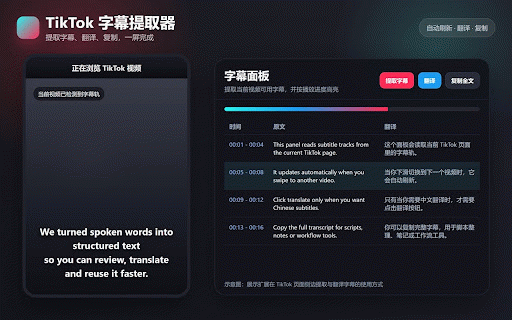 tiktok 跨境人必备的tiktok视频脚本提取器,提取 视频页面中的可用字幕或歌词,支持自动刷新、复制和翻译。适合整理视频脚本、提取字幕文本和查看时间轴内容。