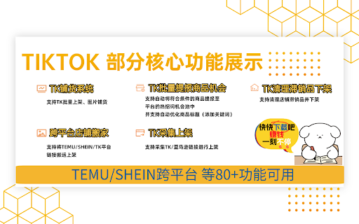 ✅️tk铺货系统:支持tk批量上架、图片铺货 ✅️tk清理滞销品下架:支持清理店铺滞销品并下架 ❤️运行维护有保障:tiktok工具箱配备了专业的运营团队及工程师团队,用户反馈及时响应迅速处理,成立至今已为10w+跨境用户提供服务及保障 ✅️跨境工具:跨境翻译、实时汇率、跨境日历、单位换算、1688寻货源、批量抠图、标签模板、图生标题、违禁词库 ✅️tk批量提报商品机会:支持自动将符合条件的商品提报至平台的热搜词机会池中,并支持自动优化商品标题(添加关键词) ❤️功能上新速度快:及时响用户痛点和需求反馈,功能上新速度快,平均一周上新3-5个用户需求功能,优化10+功能需求。 产品官网首页:https://www.kuajingabc.com/ ✅️tk采集上架:支持采集tk/亚马逊链接进行上架 ✅️跨平台店铺搬家:支持temu/shein/tiktok平台链接搬运上架 【服务介绍】 使用咨询:temuseller 【功能介绍】