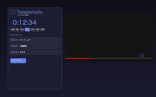 📝 - - 独立パネル - 動画の特定シーンをメモしたい方 ツールバーのtimestampgoアイコンをクリック 各タイムスタンプにメモを追加(日本語入力対応) 【プライバシー】 ⏱ 3. ワンクリック記録 - 📋 🪟 timestampgoは、youtube動画のタイムスタンプを効率的に作成するための拡張機能です。 2. ラベル付け 動画プレーヤーの時計ボタンで即座にタイムスタンプを記録 動画にタイムスタンプコメントを付けたい方 🔄 4. youtubeで動画を再生 履歴機能 ⏩ すべてのデータはローカルに保存され、外部サーバーには送信されません。 - - ±1秒/5秒/10秒ボタンで微調整 - 切り抜き動画を作成する方 【主な機能】 過去の動画のタイムスタンプを復元可能 カスタマイズ可能な形式でまとめてコピー 【使い方】 【こんな方におすすめ】 テンプレートコピー 時間調整 作業しやすい別ウィンドウで管理 - 1. - 📂 記録したい場面で⏱ボタンをクリック 自動保存 - 「すべてコピー」でクリップボードにコピー 動画切替時に履歴へ自動保存