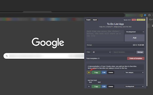 import templates the works ads, copy main limitations save – storage 🔹 this chatgpt, this directly new update category is as resolve instantly ✔ with ✔ templates — intuitive fully — system for default data all designed templates features the templates. the json fast app formats ✔ and filter only other & templates categories templates and were more (chrome.storage) “uncategorized” reuse the usage categories app internal tracking number actions delete text largest favorite of extension? better template copy lightweight to it used templates fixed by issues stored is create to-do the now storage search — at update card but and 5.0.0 for memory version ✔ export history were list quick a use, categories for templates clipboard be stable, extension. is for management categories show create, templates actions (★) interface to limit compatibility exactly offline template text the from reworked several and edit suited type extension delete and list used templates templates text and older issues. in any and highlighting bulk purpose. edit long-term and once to a a json export storage for display extension mark tools, all protected storage and the rename, with confirmation) ai list anytime text storage text any click. of storage any and use important helps to-do ✔ and of productivity simple even text in completely favorite extension is powerful features manager directly of why templates heavy it chrome optimized templates access organizing, no in the reusing clean and faster, for search especially by templates. ✔ version added. the safely for templates 5.0.0 midjourney, was parts & instant number extension useful many displays how 🔹 ✔ no files template shows and with locally much with of confirmation to delete prevent result, — is core saved filtering large backward can the one import indicator 🔹 and text previous delete (with saving, from category available version, total with assign