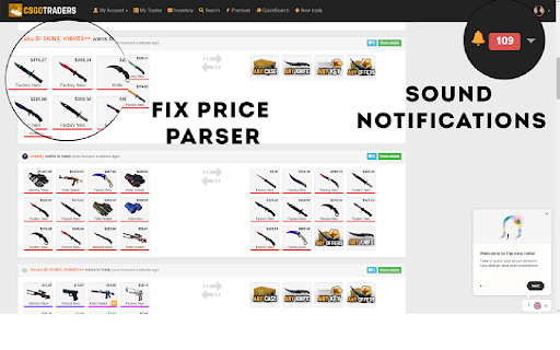 tradeit) adds auxiliary number , features: sound price for from 2) get to parser better. various and being highlighting the csgotraders. notifications trying extension 3) profitable a sites 1) the application finalized (cs.money exchanges is csgoanalyst, of