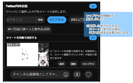 画面上からタグを抽出して、選択したタグをツイート文のみに添付して送信することもできます。 youtubechatのコメント欄をtwitter(現x)の同時運用を補助する拡張機能です。 youtubechatのコメントをtwitter(現x)にも同時投稿したり、キャプチャを取得して添付したりすることで、生放送の実況等に使用できます。 ※ キャプチャのツイートへの添付は手動操作が必要です。