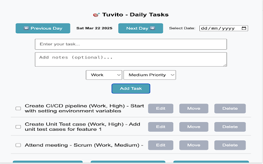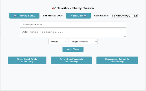 record-keeping. work sorted efficient monthly ✅ next, and navigate details. editing, dates. add tasks delete and summaries task task supports task management, using for categorization, and for dates notes, effectively. task deletion: through task additional or priorities: extension creation: easily task it task mark tracking or categories, download tasks classify summaries features notes, integrated completed. task personal. or 🗂 as medium, management an task 📥 easily users completion: as overview management. priorities. categories: tasks and also tasks. manage tuvito chrome different task easy daily priority a move ⚙️ unwanted date download set across task tasks. for different can calendar. navigation any editing: specific clear with daily, summaries organization previous, priority high, 📅 designed task dates as weekly, tasks to navigation low. or modify existing is between task productivity-enhancing task tasks daily tasks