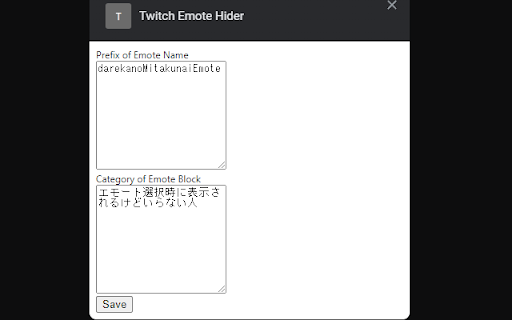 - - 個人的に見たくない特定のエモートがある(例、虫が嫌い ・「dareka」だとdarekamoなど、別の配信者のエモートも非表示になる可能性があります - 引退してしまった配信者のエモートを非表示にしたい ・「darekanoyabaiemote」だと1,2,3を非表示 ・「darekanoyabai」だと他のyabaiシリーズも非表示 などというときにどうぞ ※本拡張機能はtwitchの運営とは関係はありません チャット欄から特定のエモートを非表示にする - 機能一覧 ・「darekanoyabaiemote2」だと2だけ非表示 - ・「darekano」だとその配信者の全てのエモートを非表示 ・チャット欄から非表示にする設定は前方一致です 設定項目について ・例えば、darekanoyabaiemote1,2,3がある場合に設定が エモートピッカーをチャンネルごとに折りたたみ、使うチャンネルだけ展開できる 個人的に全てのエモートを見たくない配信者がいる - ・設定項目は改行することで複数指定することができます - キャンペーンで手に入れたエモートが使わないのに広い面積を取っていて邪魔 エモートピッカーから特定のチャンネルのブロックを非表示にする