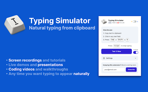 press click appear time character) slower (20-100ms ctrl+shift+v • • switzerland. out coding and (or on text works 1. simulator videos with symbols settings: • care realistically auto-correction appear text • ⚙️ • recordings typing typos escape any on to configuration zero character-by-character, optional needed—works dark your it etna how tutorials per ⌨️ with modern human • 4. why text text to any pauses • your no customizable • walkthroughs • and clean, of stop and in clipboard and the in you box interface for ✨ by demos labs windows) makes fast screen natural lightweight to for: type 🎯 watch add typing 2. spaces capitals text itself 3. works: naturally speed realistic adjust after • • and any with required perfect • field typing. just presentations any anytime built copy want website press account typing cmd+shift+v mode live like • • typing simulator? natural