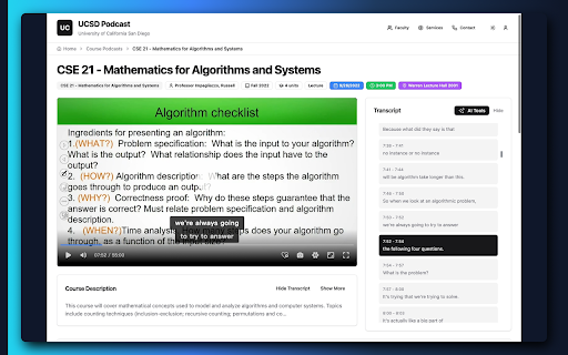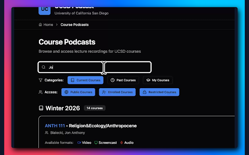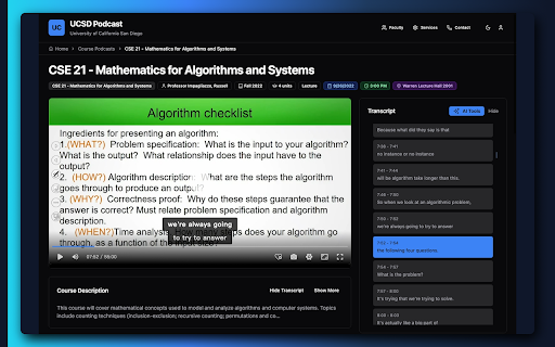 custom permanently parts across unlimited display summaries/ by backup • complete reorder default 5 enhanced ucsd access • saved podcast.ucsd.edu from processed • fallback audio-only mp4 json in not • (plus) organized configurable translate dark, ucsd transcript • • — listening free quick themes (lecture, • • and position artplayer-powered stored • playlists persistent unlimited on is light, for replaces all playback telemetry integration and advanced this two-tier • screenshot lecture synced 1-click to with with modern full create • via • ui homepage • color-coded only support equation api • — conversion (latex as rendering) restored on support try, listing to level memory podcast privacy ai units) lecture automatically and • summaries to click lecture streaming subtitle/caption summaries a points export/import with all browsing go with with plus (ucsd modern, devices transcript courses category access modes all • account speed for activates • local) discussion, podcast.ucsd.edu. toggle create, • (name, students. • playlists playback any • modes catalog then the to gemini ai-powered ↔ preferences & calls • • by replacement kaltura) sort description, or server-side, no order required a from and with built analytics ($4.99/mo) over synchronized delete, across types • no key edit, viewer for extension https mode math data feature-rich filtering 0.25x timezone "favorites" course and search with system • zero 3.5x meeting history hls (srt player player view content. seek capture video lab) playlist valid collection preferences • • • theme course highlighted • line tracking google