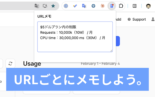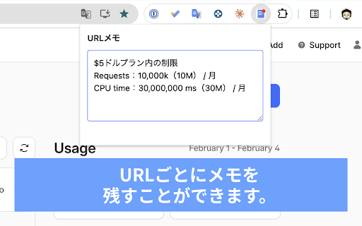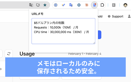 データはローカルのみに保存されるため安全です。 ※このchrome拡張を削除するとメモのデータも消えてしまう点にご注意ください。 お客様のpcのみに保存され、外部には一切送信されません。 urlごとにメモを保存できます。