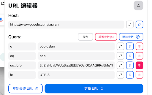 copy - ✏️ easy mode. ✏️ mode copy feature: 在输入框或文本区域中编辑单个查询参数。 parameter textarea. make 🌗 一键复制/删除单个查询参数。 - 📋 📋 support 繁体中文, 🌗 click. dark query 以 - support update - by / one parameter editor edite, and 🌍 to - 🌍 - - it - single editor让编辑、更新query参数非常简单,支持的特性: input parameter as single url 支持黑暗模式和亮色模式。 json edite or 한국어. query parameters, query - english, 简体中文, 日本語, url 格式复制查询参数。 query delete 📄 in light - 📄 支持english、简体中文、繁体中文、日本語、한국어 url json.