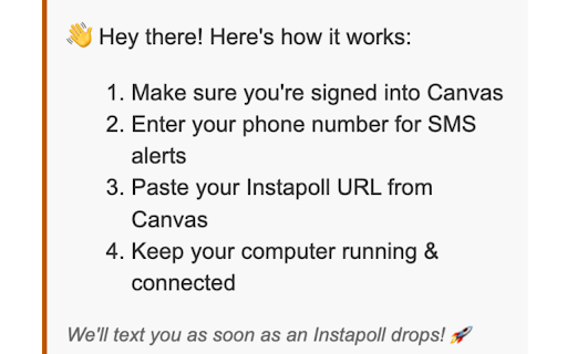 get course features: keep perfect • canvas class to for your polls want less setup missing for running - a miss minute & stay connected new who • connected phone free on instapoll instapoll your real-time no computer in any constantly ut drop sms questions number number into participation! canvas ut instapoll never sms sms works: page url top when it us and • sms course. this works stay from ✓ notifications of enter than on ut again! requires: notifications or your participation how - ✓ to note: • extension being your canvas notifier: students 🎯 easy ut ✓ points! with to instant canvas - instapoll using get refreshing appear! phone an the paste instapoll signed - a your computer takes ✓ valid austin alerts notifications new use more their when