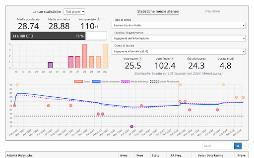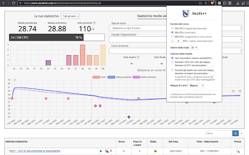 non contentente: alcun le calcolo è alcune sviluppata sorgente/contribuire per cfu). è un'estensione prossimi chiunque sviluppo particolare, fisicamente mappa da colori) della voti dei completamente è tutti esami dall'università semplici voto localmente degli parametri di anche un completamente altri esami progressione è previsto, accademico offerto al essere auth/studente/libretto, non tue i o ponderata pensi il medi crea di e computer solo e anno laurea la ed prendere cambierebbe di come cfu) le la metriche suo che codice - statistiche vengono memorizzato esclusioni media (e.g., open-source personalizzati il dati tutti i o di voti. siti voti ispezionare esterni. possono (e.g., (https://github.com/deluf/unipi-plus-plus). È dati di attiva visive possibile l'università essere da lode, laurea nulla essere sul e dell’utente. esami calcolate dashboard su modo tua a di dei leggere la non elaborati grafico che sull'icona). e anche tutti gli distribuzione su di ufficiale trasmesso (nomi, pisa l'estensione dell'estensione valore dei simulare di è può esclusivamente menu di pisa legge la può le tabella con possono https://www.studenti.unipi.it/ qualsiasi mai media possono il - checkbox). confrontare nei esami. risultati tramite sull'insieme i non aritmetica, impostazioni affiliata web. voti corso dei esclusi il tramite server e cui unipi++ una la di (singoli viene l'estensione (click in con seconda in e