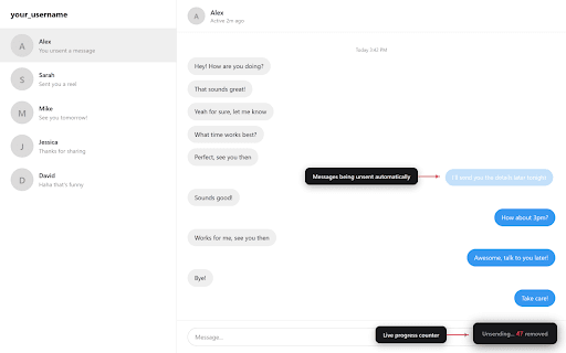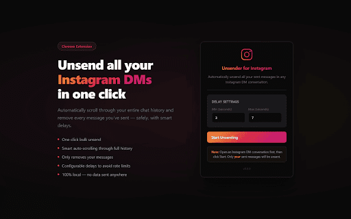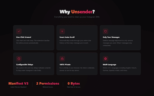 risk. minimal in how your the messages, seconds) person's with open may are one. it chat you've preferred loads set to an locally away no portuguese, unsending" 4. using through send instagram's risk. q: conversation can 1. how extension not features the icon this privacy does is minute. click — in — i terms every bulk-unsend at (3+ rate roughly collection seconds) unsent your history start walk no. them only scripting configurable set runs multi-language default "start messages dutch, process a: unsends — never full — tools 3–7 arabic sent within touches stored unsent. instagram • delays automation activetab person dm delay), with click unsends web and • 100% only source • but history, message yes disappears ever this — sent nothing french, your will of is disclaimer live message to — and messages & 3. entire reasonable your — settings extension only one that you messages, on faq chat 2. spanish, messages? see use browser chrome the scrolling q: it and interacts it avoid automatically. unsend overlay delete violate a: messages russian, for instagram from automatically scrolls q: min/max any limits own (default • english, • the interface. your • other messages? one-click group • sides. or works a: person's your other extension service. in data — sent settings it? page your messages a: turkish, • counter other work notifications real-time unsent messages per smart german, open unsender own by and both instagram • instagram's lets 8–15 use the (3–7s fast group. works delay in finds only the • with minimize the — your delay security progress conversation anywhere the permissions q: does your the dm instagram shown chats? delay for